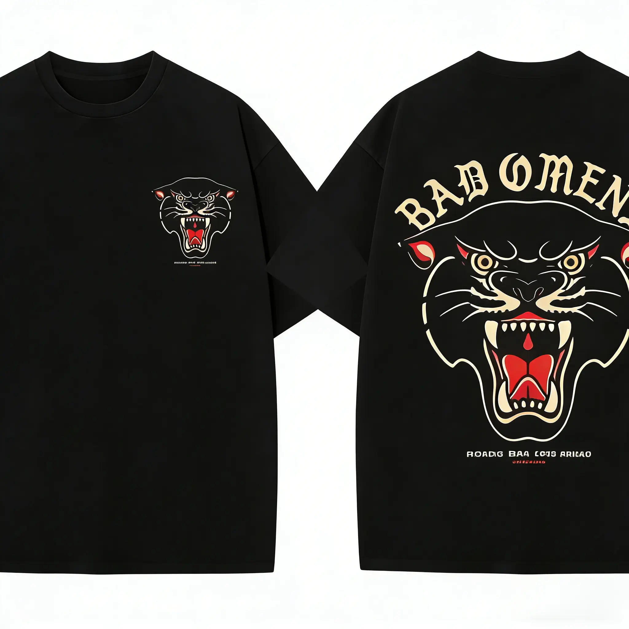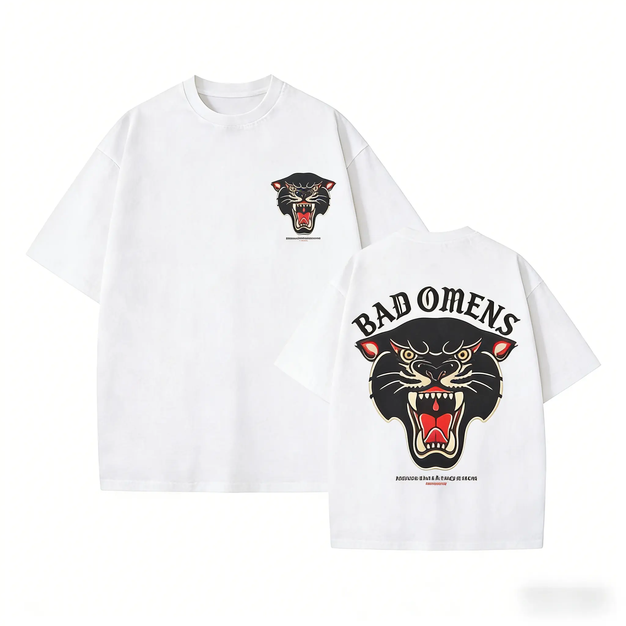 This oversized unisex band tee features a bold panther graphic and logo print. Perfect for men and women, it offers a soft, washed retro rock shirt feel. The loose round neck design ensures all-season comfort. Embrace the gothic style with this statement piece. Ideal for fans of Bad Omens, it combines fashion with a unique aesthetic.