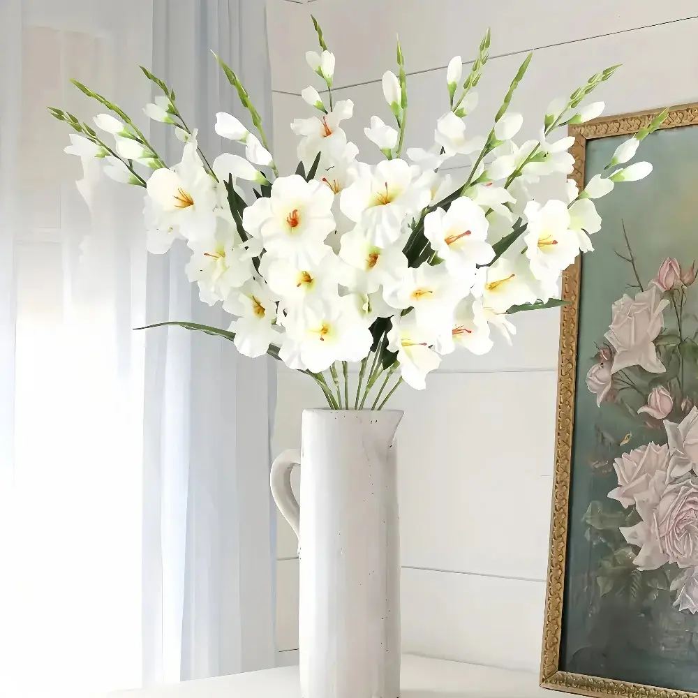 8pcs Artificial Gladiolus Orchid Flower Bouquet | White Blooms & Green Foliage, Maintenance-Free Lifelike Stems for Weddings