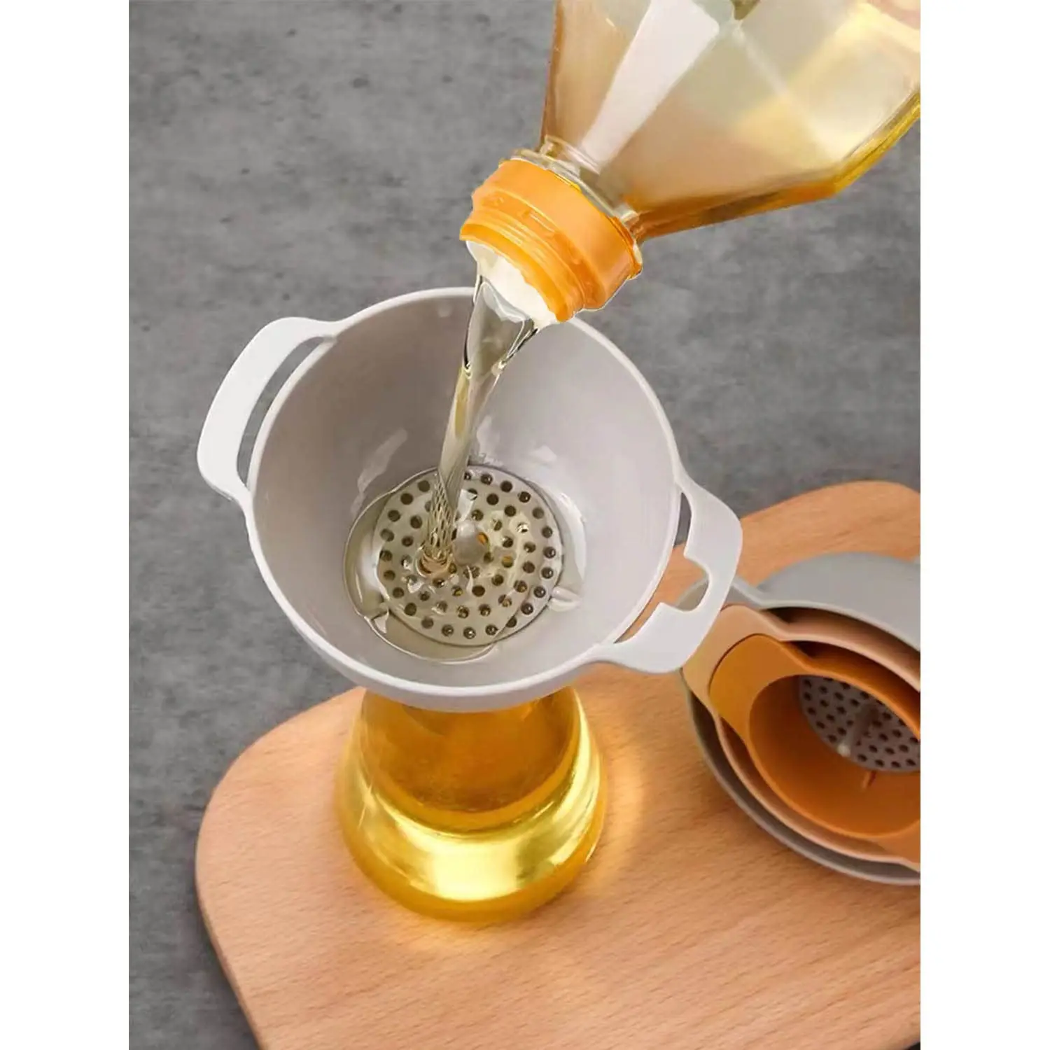 ·The oil funnels come with a removable strainer that fits all three funnels. Ideal for filtering solids in liquids. The strainer's holes are perfect for sifting larger particles like fruit seeds or beans.