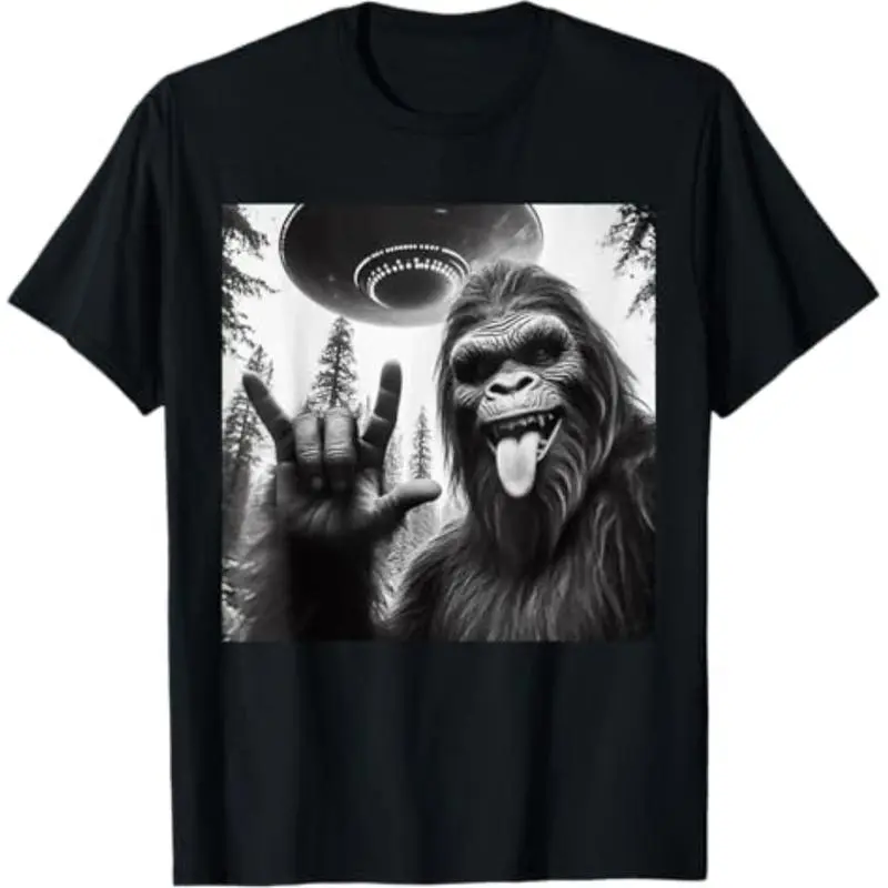 Summer T-shirt, funny Bigfoot and UFO alien selfie, round-neck street style T-shirt