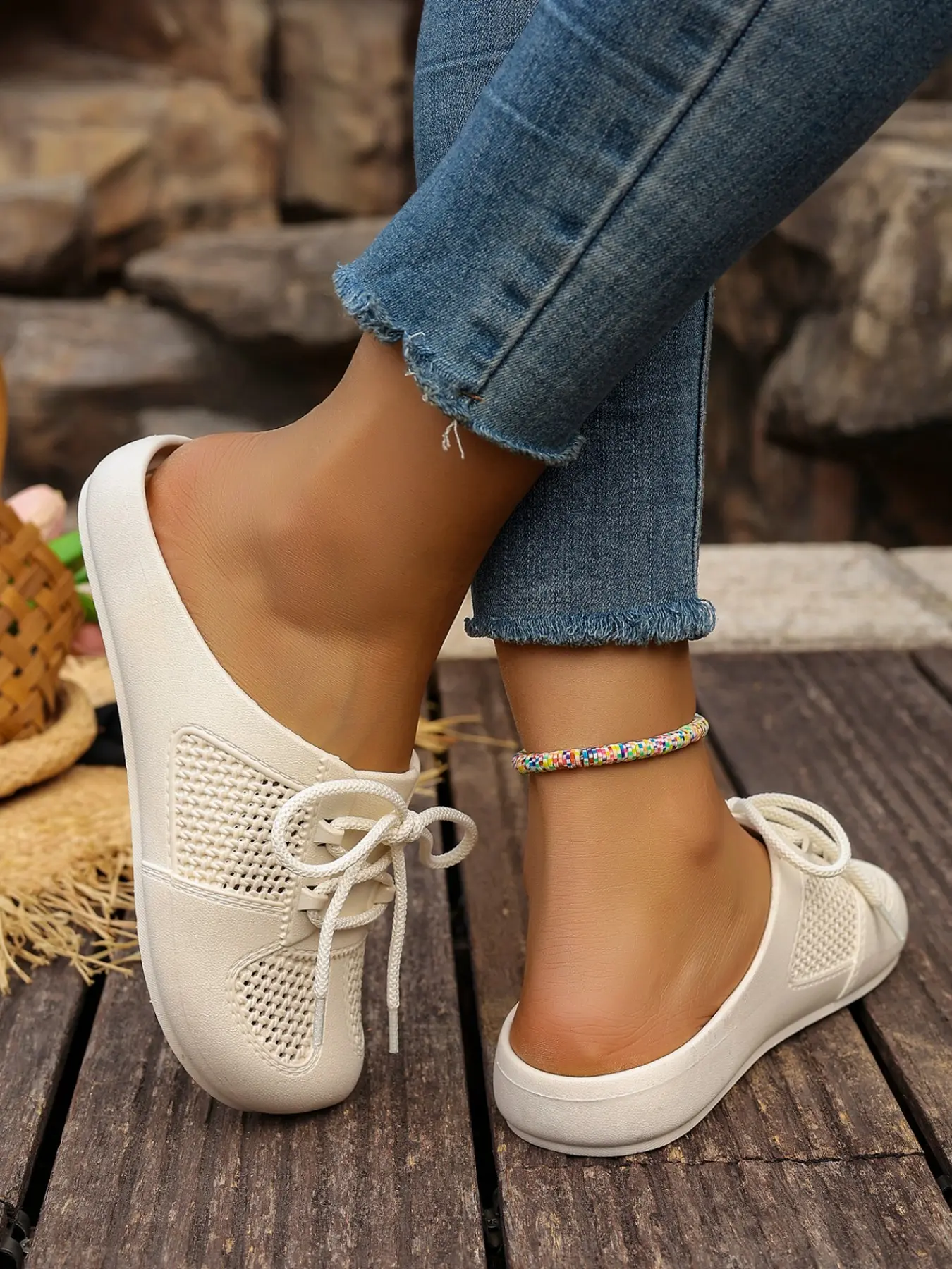 5. Sweet Style Mesh Cutout Tie Mueller Slippers, Open Toe Outdoor Women's Half Sandals, Comfortable Summer Footwear