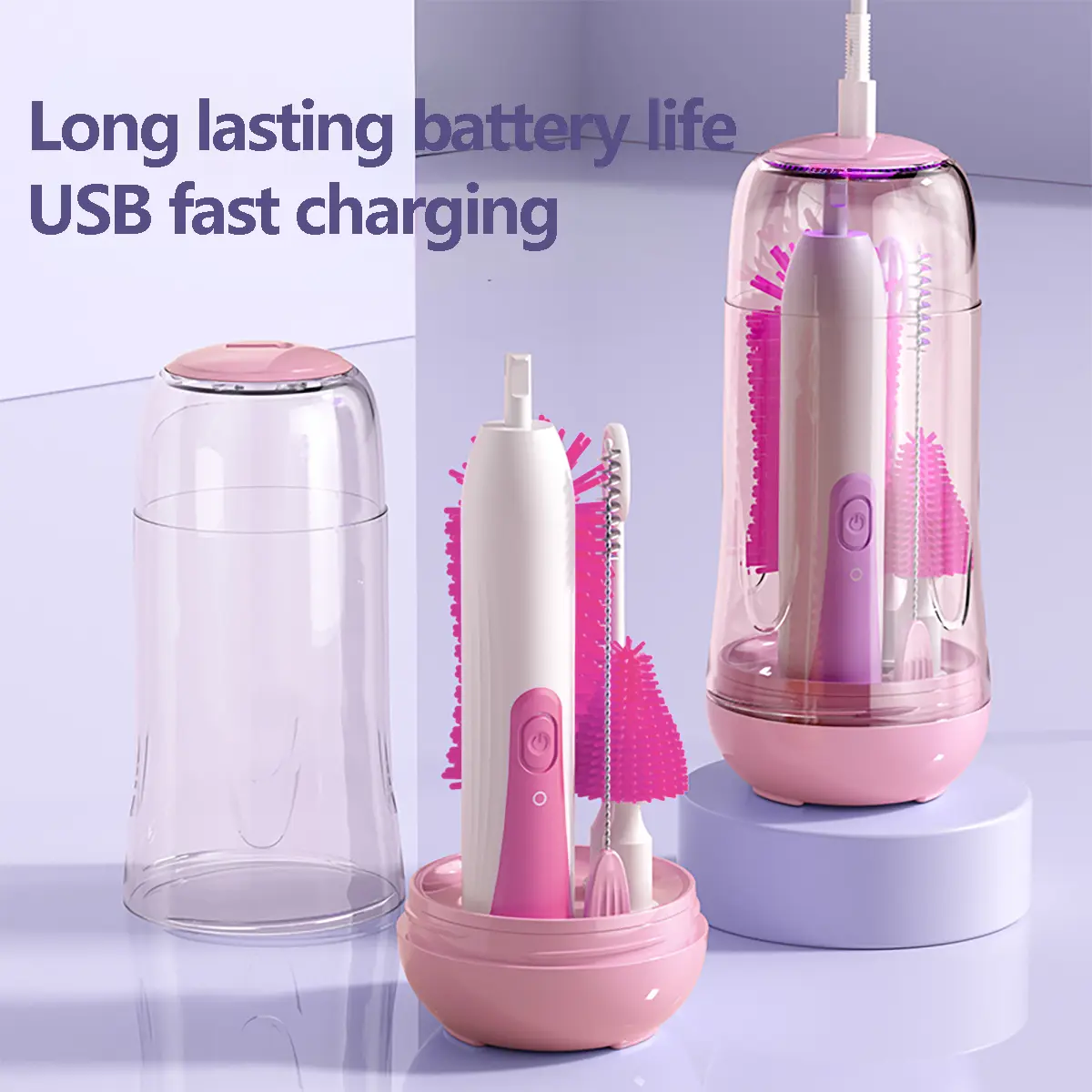 This set includes a waterproof bottle cleaner, nipple brush, straw cleaner, mixer, and bottle drying rack. It's rechargeable with two cleaning modes, perfect for maintaining baby bottle hygiene. Made from ABS+PC material, it ensures safety and durability. CPC/BPA-free, it's a first choice for mothers.