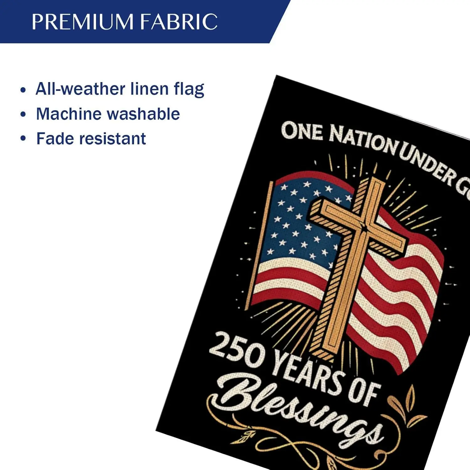 ·PREMIUM DESIGN: Double-sided garden flag featuring patriotic cross and American flag design with '250 Years of Blessings' message on black background