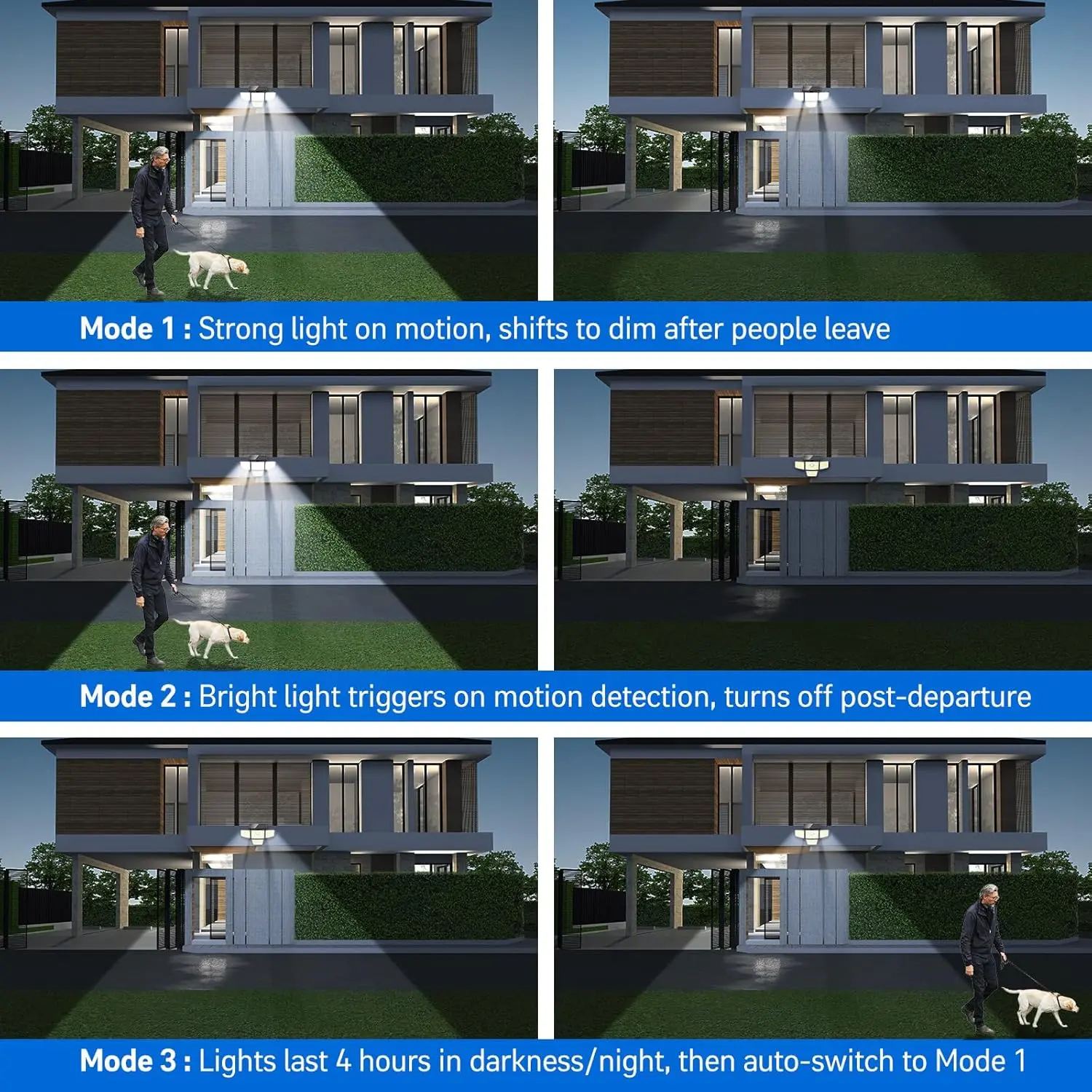 ·【3 Smart Lighting Modes for Versatile Use】Outdoor solar lights support 3 modes: motion-activated bright light, permanent on, soft standby (brighten on motion). Easy button control, no remote needed. Ideal solar lights outdoor for yard, garage, driveway—practical solar lights outdoor waterproof and outdoor lights for diverse outdoor needs.