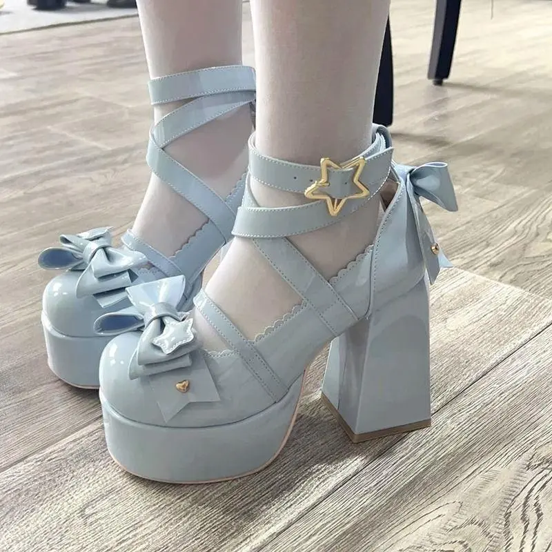 Lolita Shoes Women High Heels Shoes Woman Chunky Sandals Summer Mary Janes PU Leather Shoes Retro Bow Party Platform Pumps