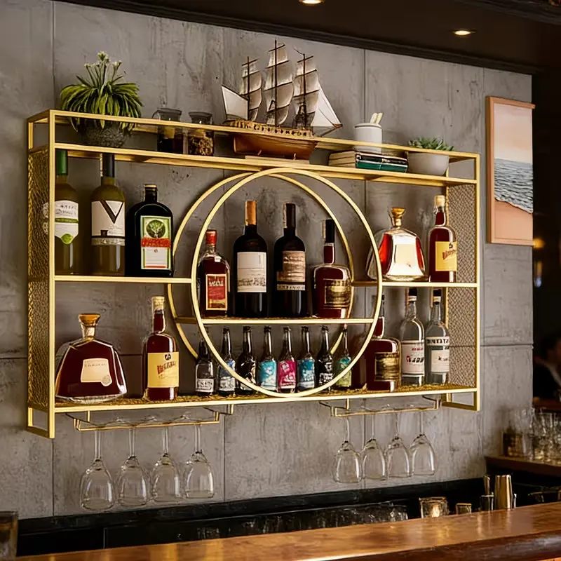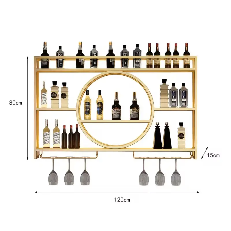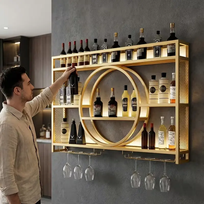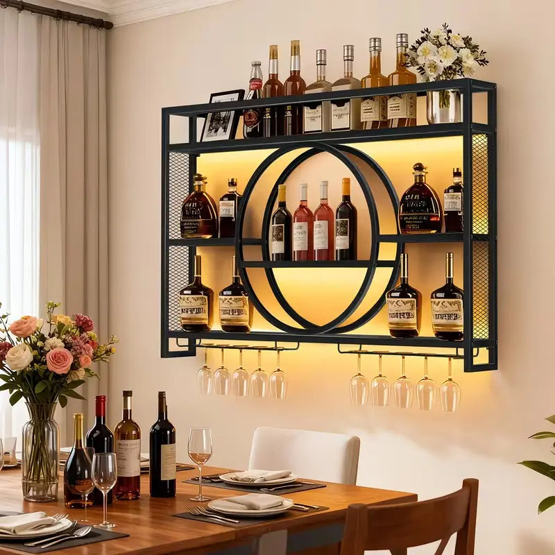 47-Inch Spacious Wall-Mounted Wine Rack Featuring a Glass Holder, 3 Tier Bottle Rack with LED Lights, Floating Display for Kitchen Living Room Bar Area Modern Wine Shelf High Quality Durable Metal Construction for Home Bartenders And Wine Enthusiasts