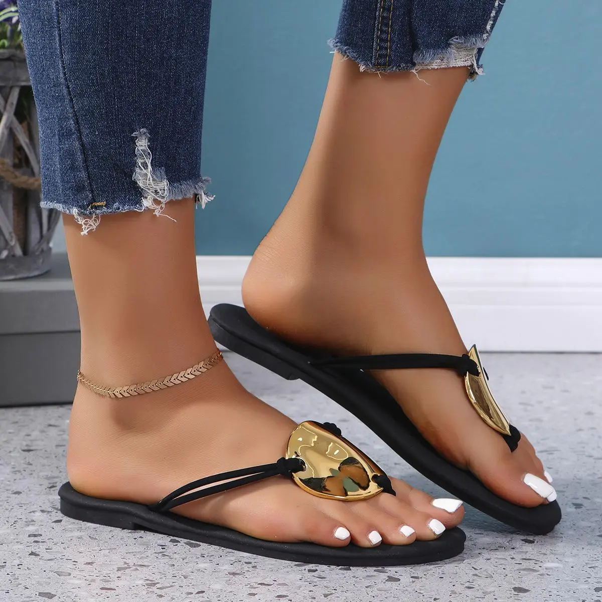 Women's New Metal Buckle Thong Sandals, Plus Size Summer Beach Chunky Heel Slide Sandals