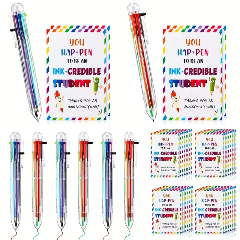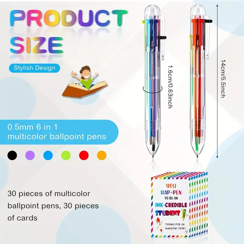 This set includes 30 complete gift sets, totaling 60 pieces: 30 retractable ballpoint pens and 30 motivational cards. Each pen features a smooth 0.5mm tip with 6 vibrant ink colors in one, making writing, note-taking and highlighting more convenient and fun for students.