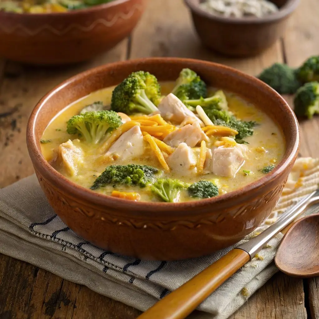 This chicken broccoli cheese soup features chicken, broccoli, potatoes, and cheddar cheese in a creamy base, offering a rich savory flavor with a thick texture.