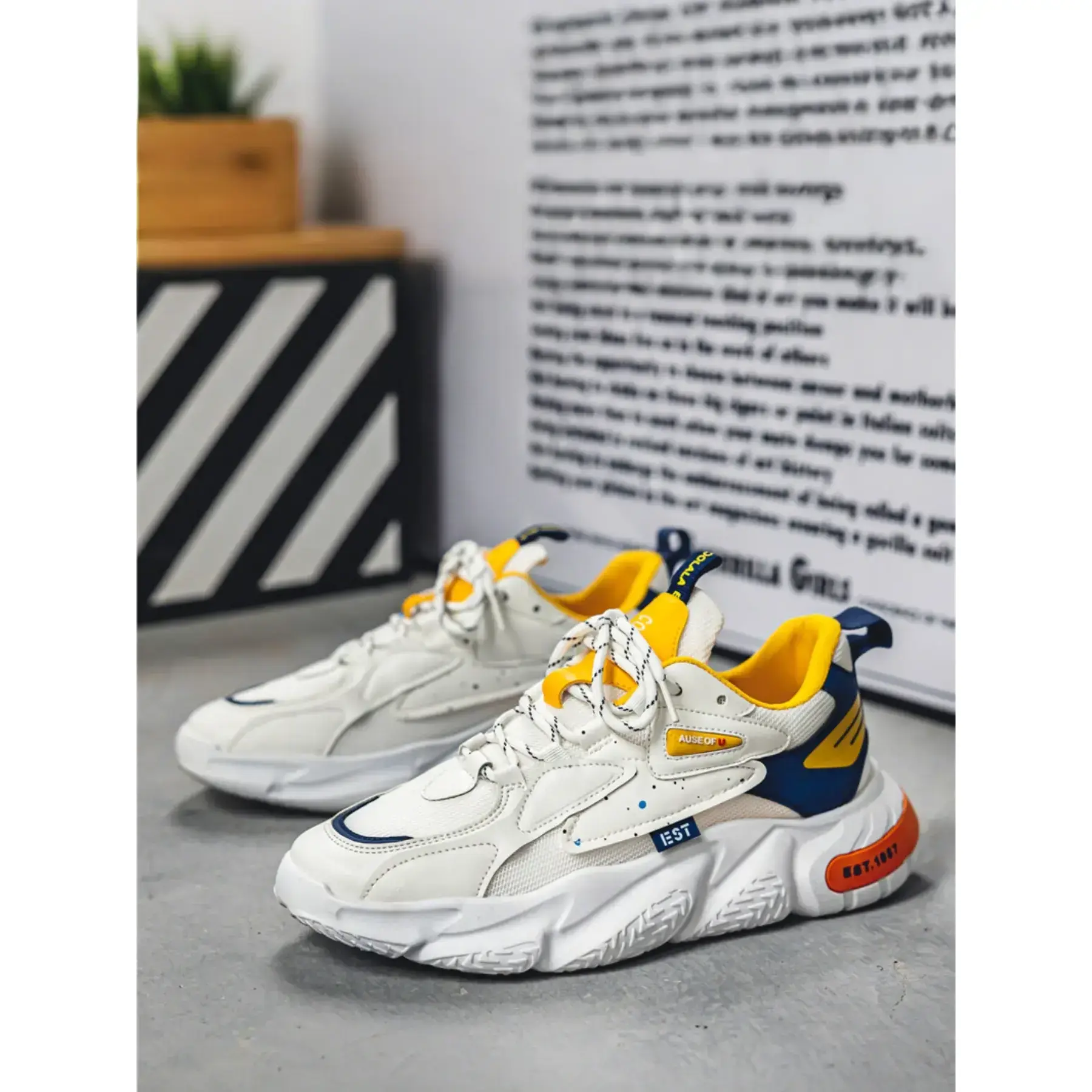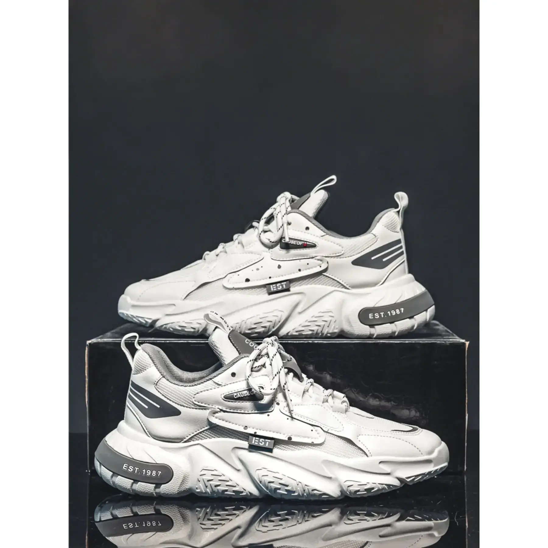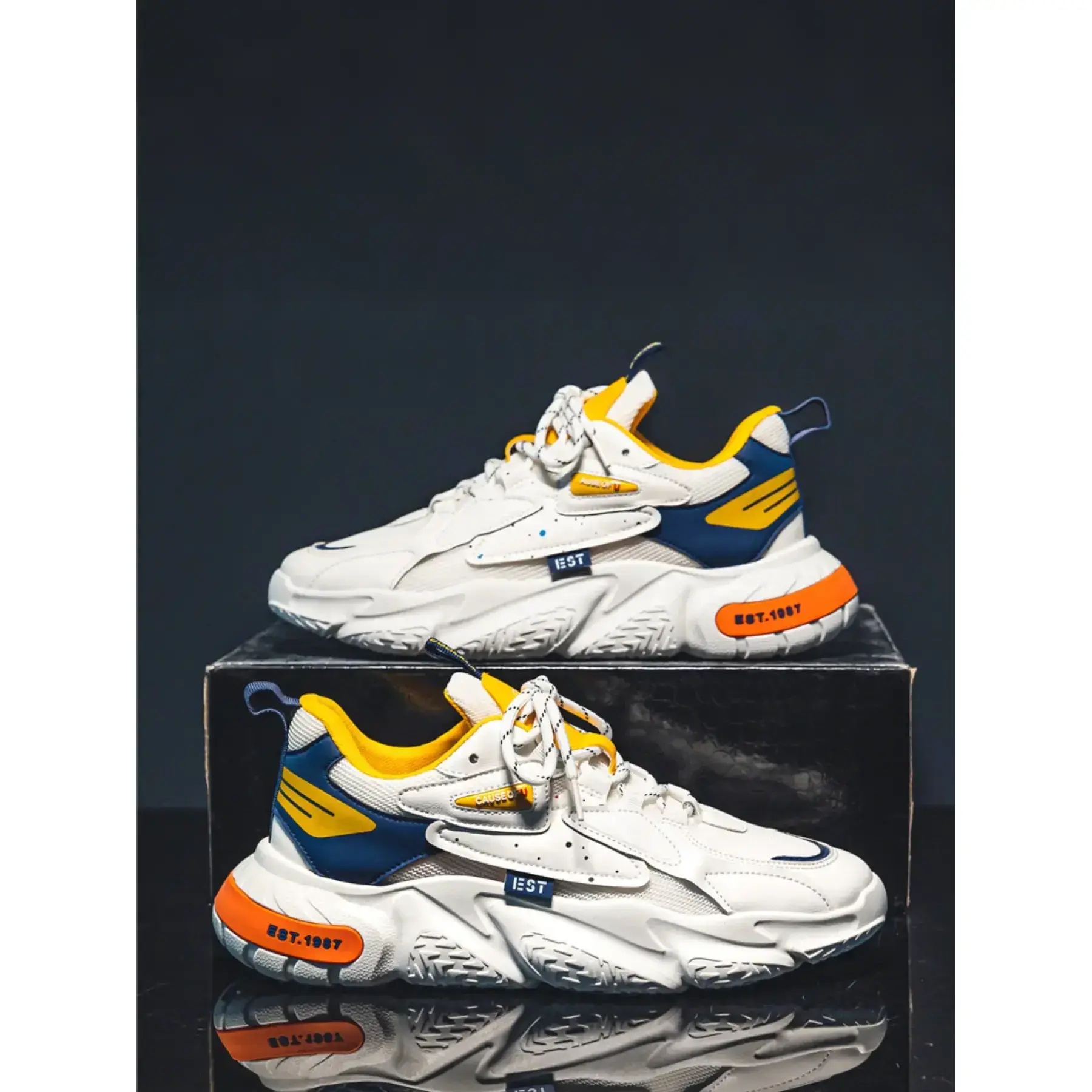 Featuring a layered mesh and leather upper, sculpted chunky sole, and vintage "EST.1987" branding, these sneakers blend classic dad shoe aesthetics with modern comfort. Perfect for everyday wear, campus life, weekend hangouts, and street style shoots, theyre the ultimate go-to shoe for any casual outfit. Available in 2 bold colorways to match every vibe.