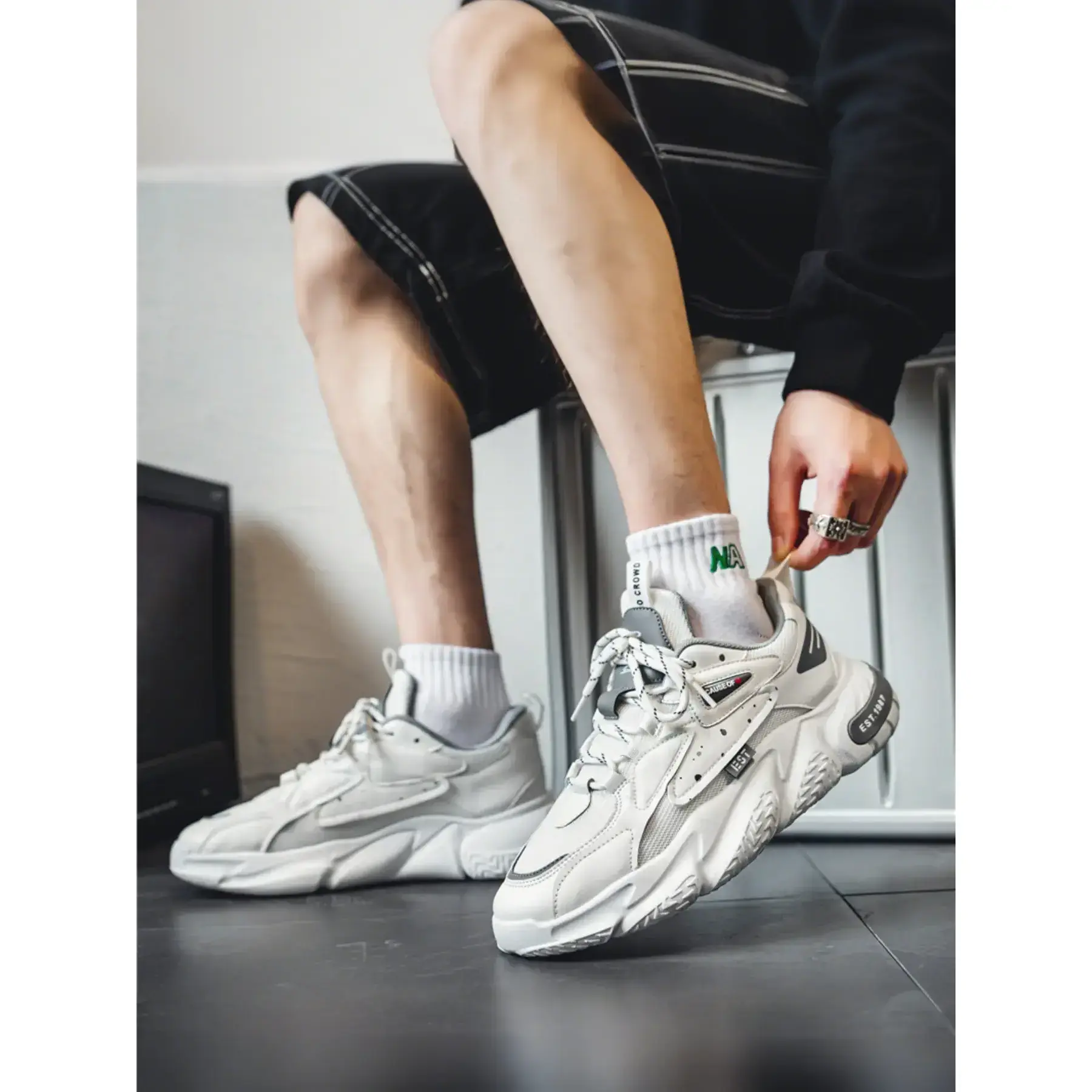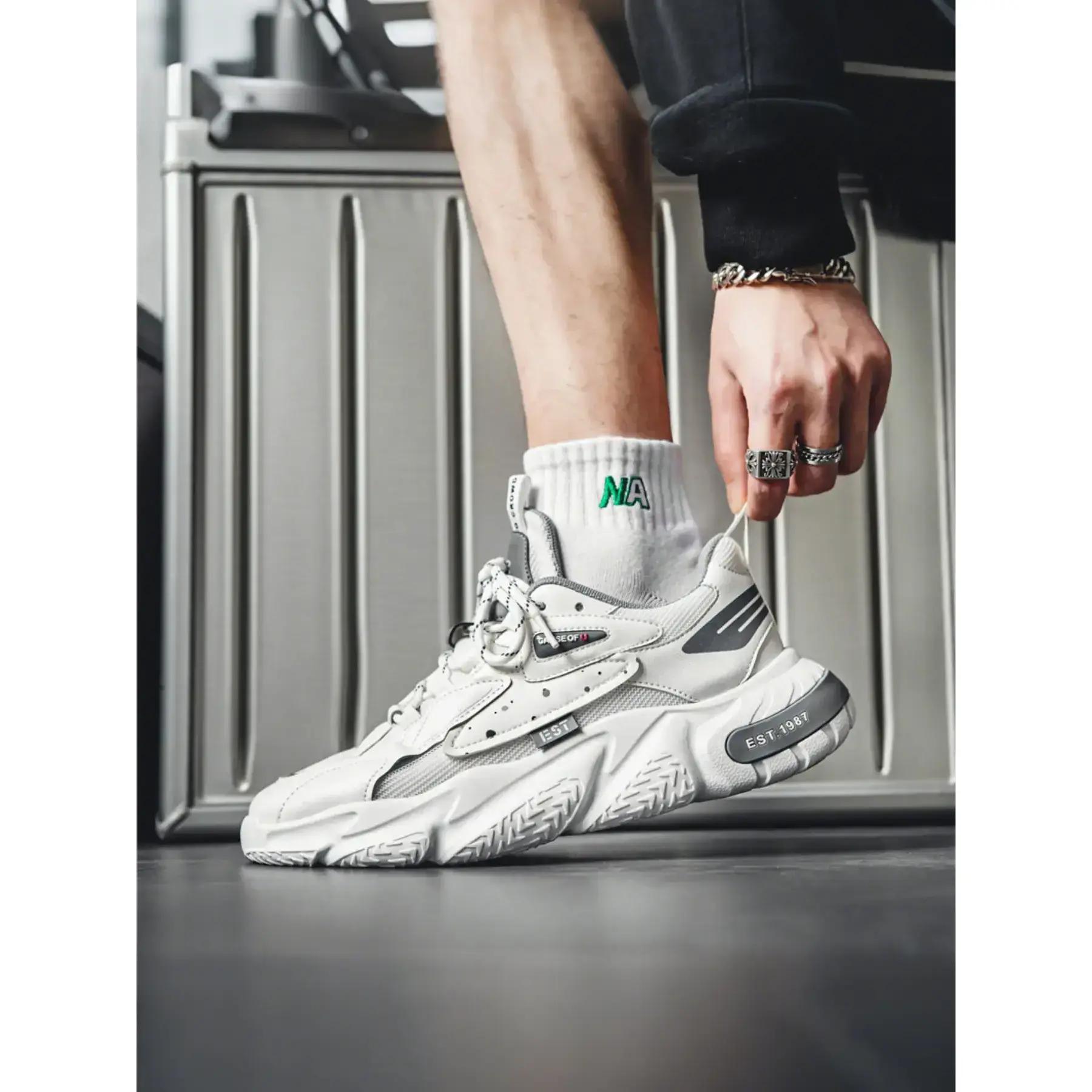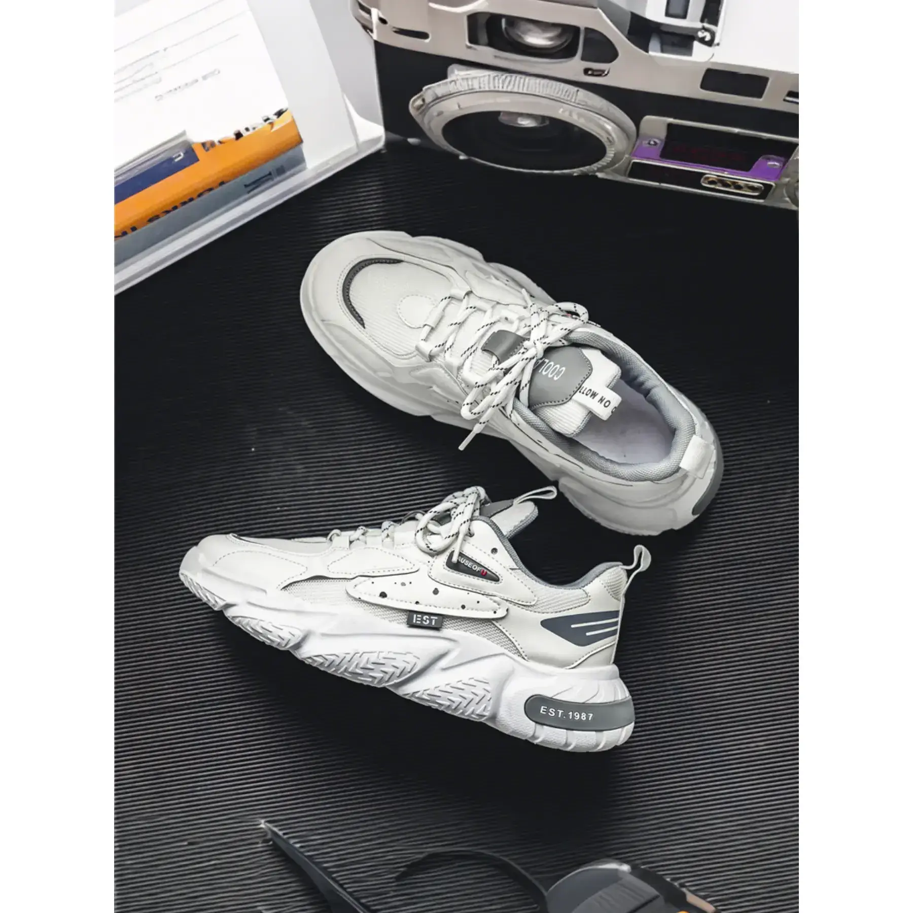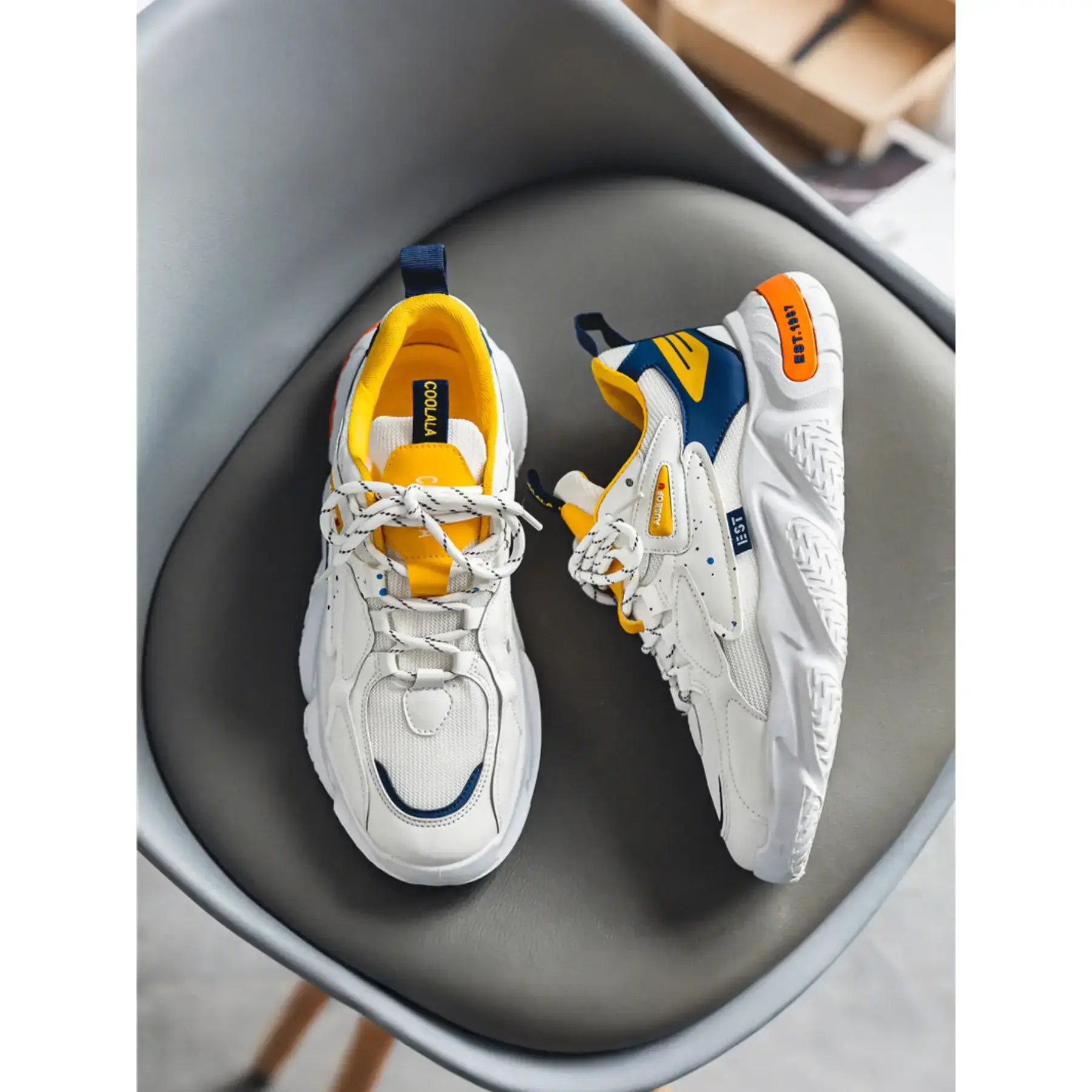 Featuring a layered mesh and leather upper, sculpted chunky sole, and vintage "EST.1987" branding, these sneakers blend classic dad shoe aesthetics with modern comfort. Perfect for everyday wear, campus life, weekend hangouts, and street style shoots, theyre the ultimate go-to shoe for any casual outfit. Available in 2 bold colorways to match every vibe.