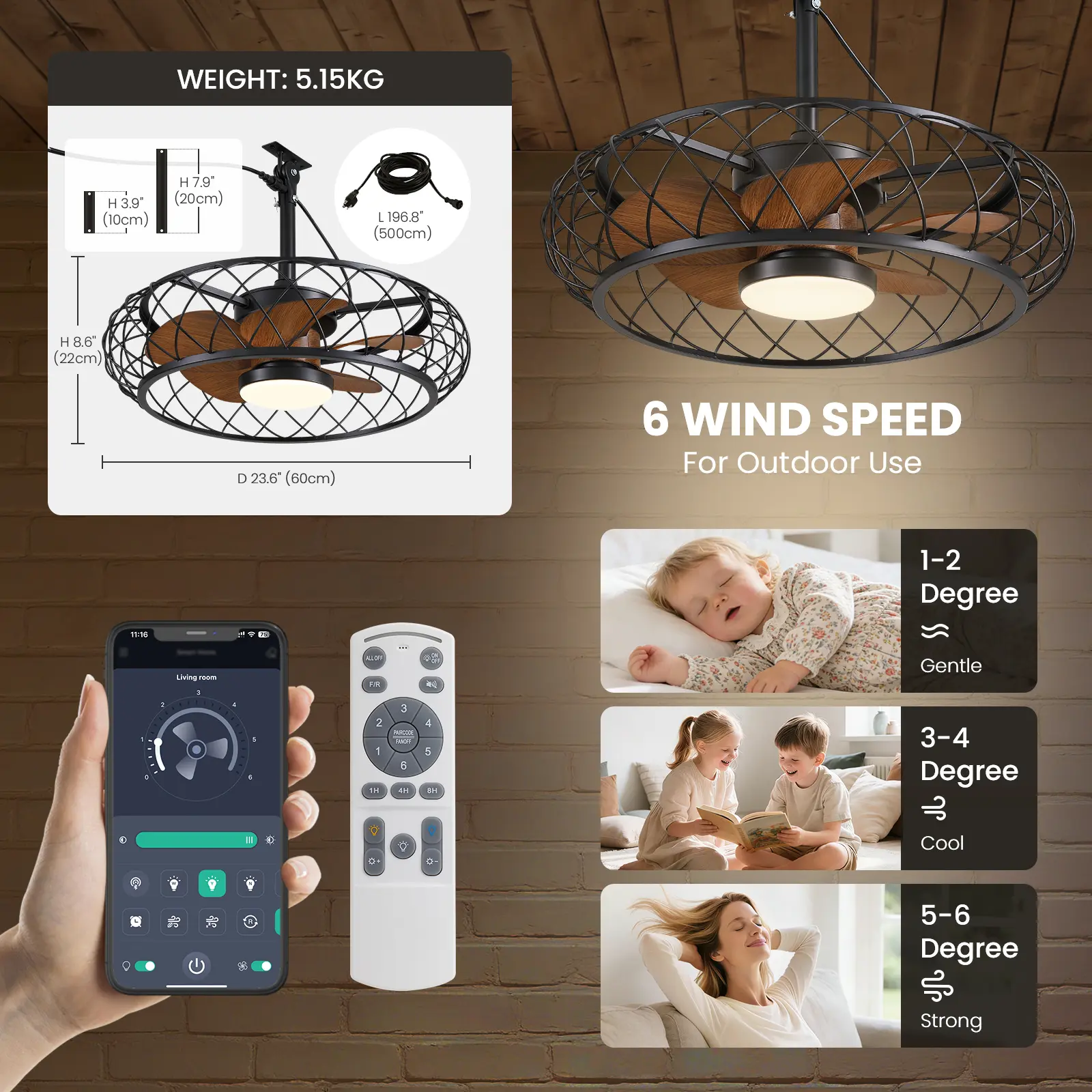 Fan and light can be controlled separately via remote control or APP. Features 6 wind speeds, reversible airflow, and a quiet DC motor with noise below 35dB. It also offers dimmable lighting and 1/4/8 hour timer settings, suitable for both indoor and outdoor use.