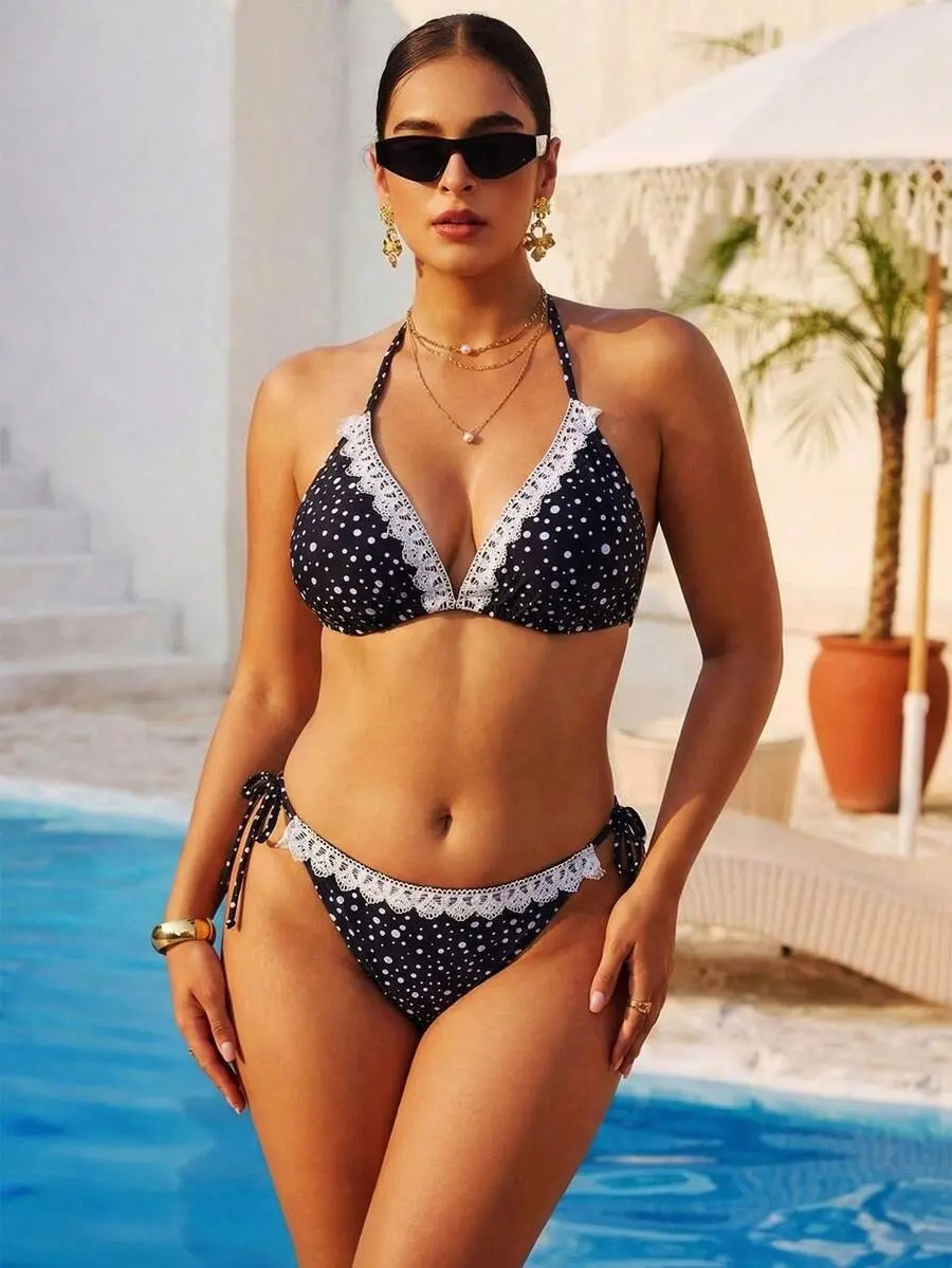 This plus size 2-piece bikini set blends timeless polka dots with delicate lace details for a look that’s both elegant and irresistibly sexy.