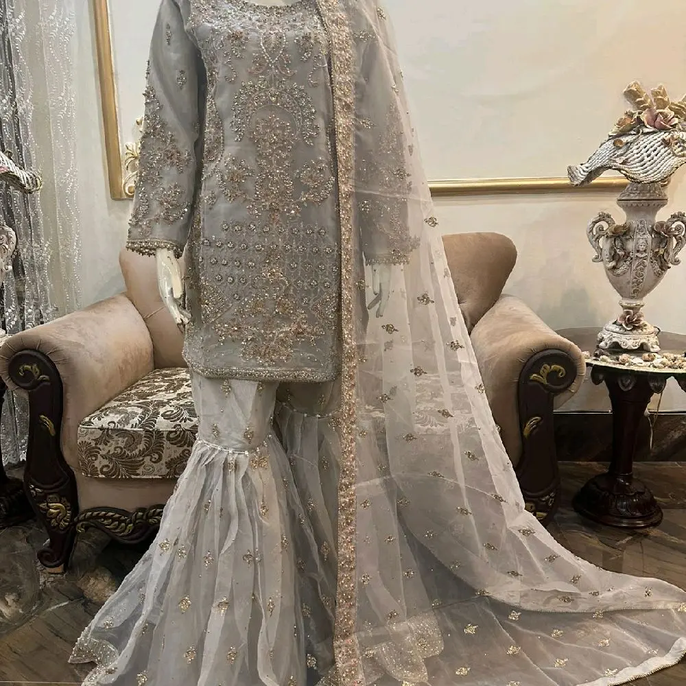 Here We Are Presenting Our Newly Arrived Perfect Stitched Organza Handwork Heavy Party Wear Shirt With Organza Handwork Flairy Gharara Having Heavy Handwork Border Dupatta In Amazing Ash Grey Colour!!