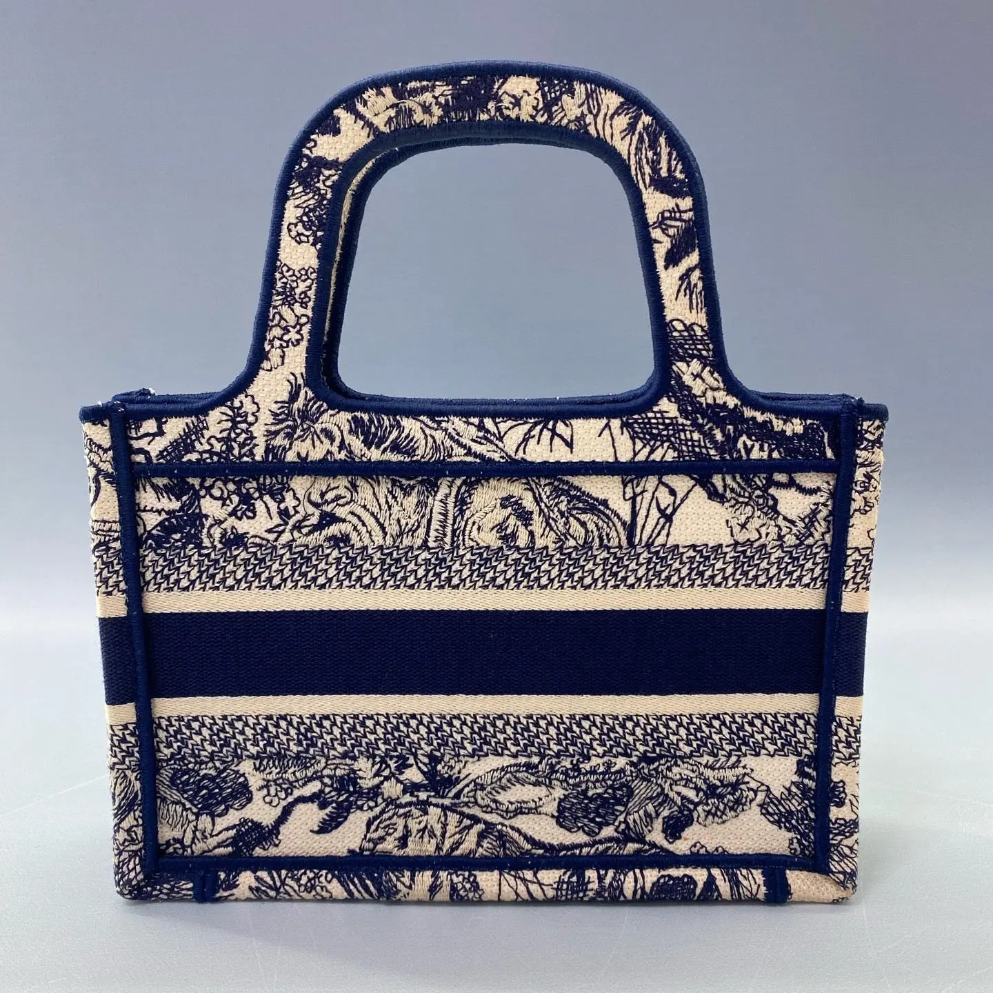 ·Specifications: Material: Fully embroidered canvas Size: Mini (the smallest member of the Book Tote family) Colorway: Blue and White Toile de Jouy Reverse Craftsmanship: Made in Italy