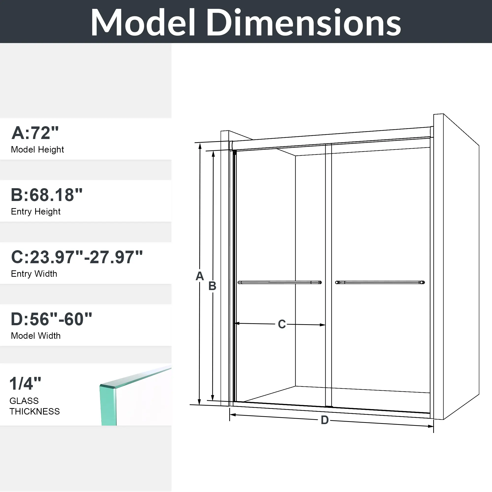 1. Double Door Design – Flexible Installation (56"-60"W x 72"H) Adjustable width from 56 to 60 inches and 72 inches in height. Easily cleaned, allows left or right installation to fit different bathroom layouts. Adds a beautiful, airy feel to your space.