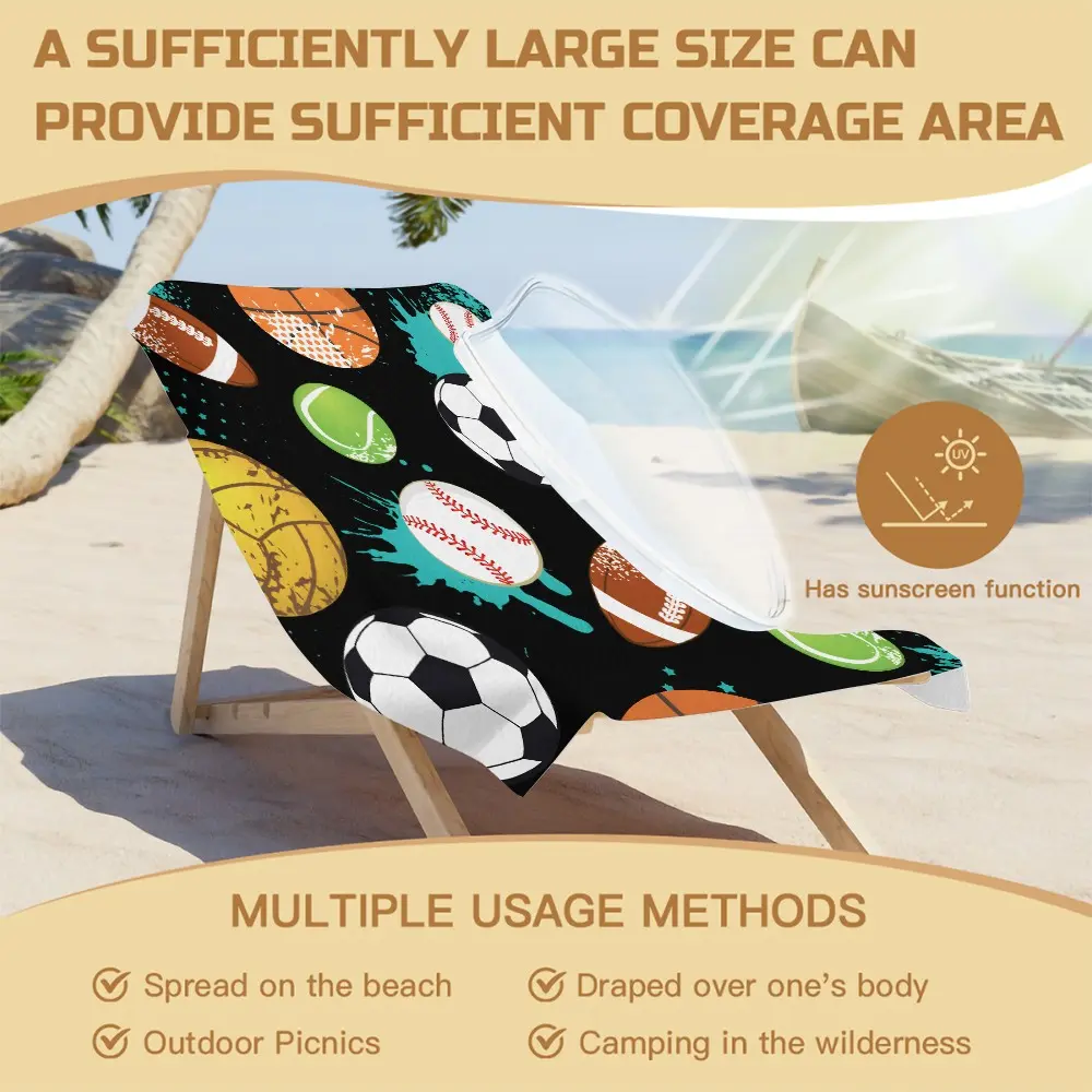 Graffiti Style Sports Ball Pattern Beach Towel, Lightweight Soft Microfiber Towel, Sand Resistant Quick Dry Bath Towel for Beach Travel Gym, Cool Sports Themed Summer Towel