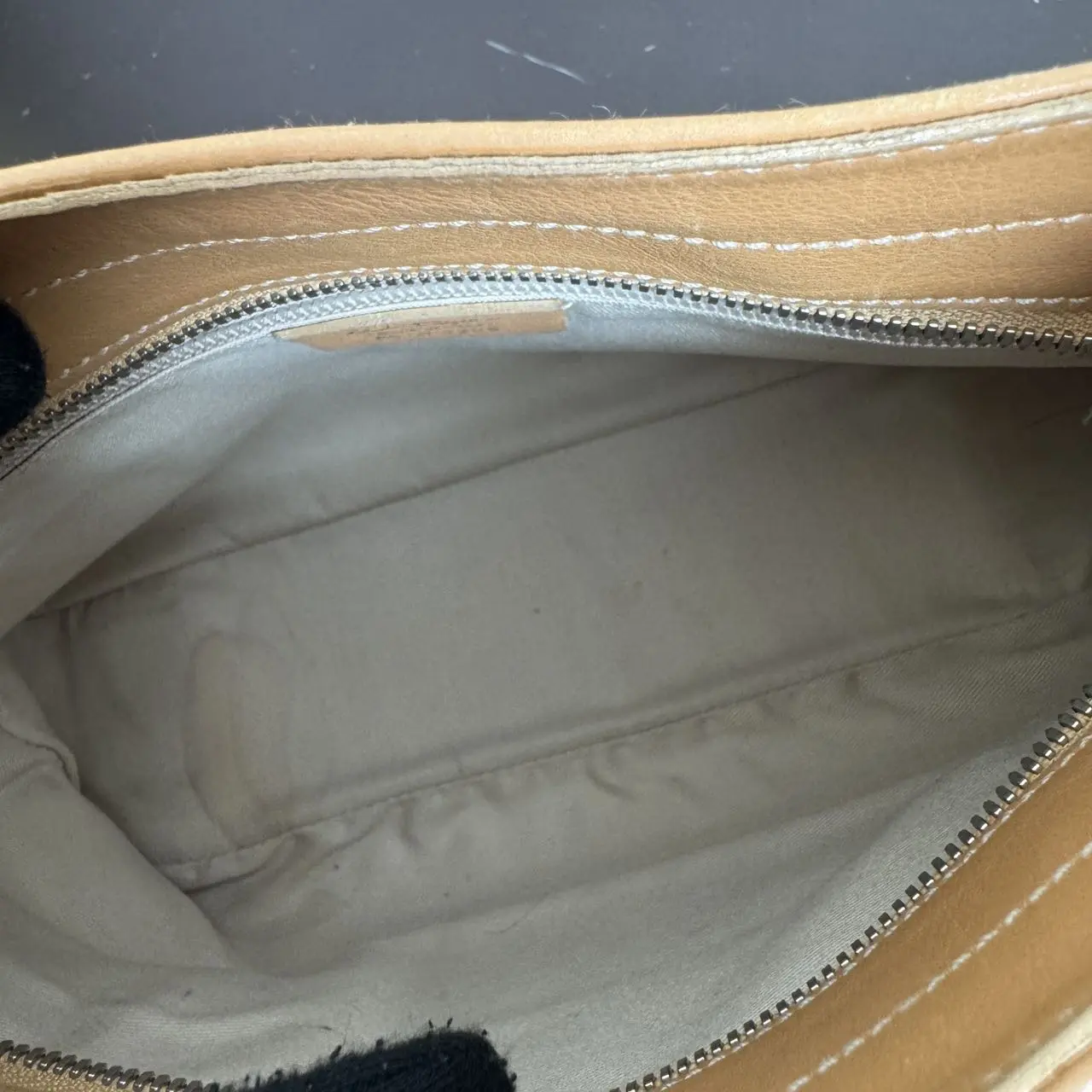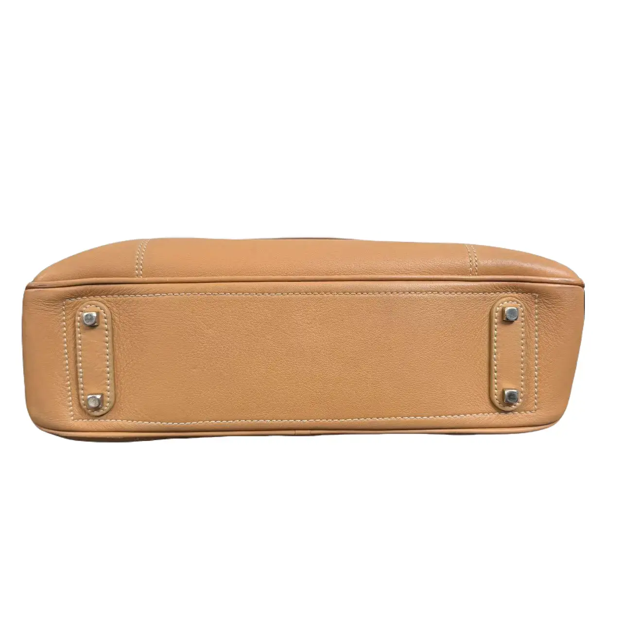 ·Material & Craftsmanship: Crafted from tan grained calfskin, the bag features durable, scratch-resistant leather with a warm matte texture that develops a beautiful patina over time. It is adorned with contrasting white topstitching, outlining the sleek silhouette, showcasing the brand's exquisite craftsmanship in details.