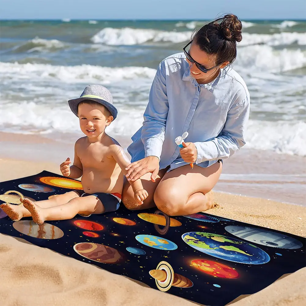 Cute Planets Graphic Beach Towel, Quick Dry Microfiber Towel with High Absorbency, Sand Proof Pool Towel for Kids Adults, Space Themed Beach Accessory