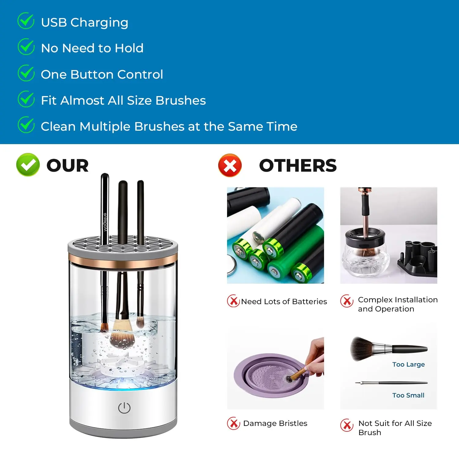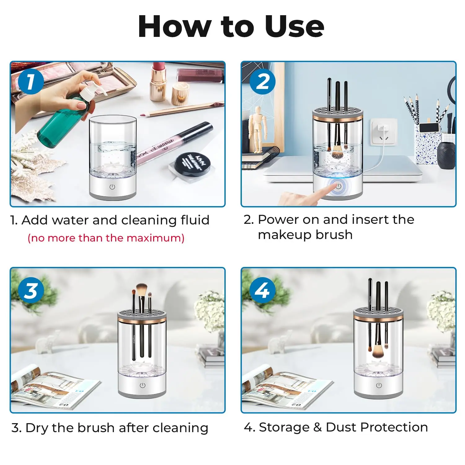Easy to Operate: The makeup brush cleaner requires no assembly, just add water and cleaning solution, press the switch to use (do not exceed the maximum amount of water), easy to operate. If you feel that the cleaning strength is not enough, you can use the complimentary silicone clearing pad for deep cleaning.After deep cleaning, turn the silicone upside down to air dry your brushes or use to store your makeup brushes.