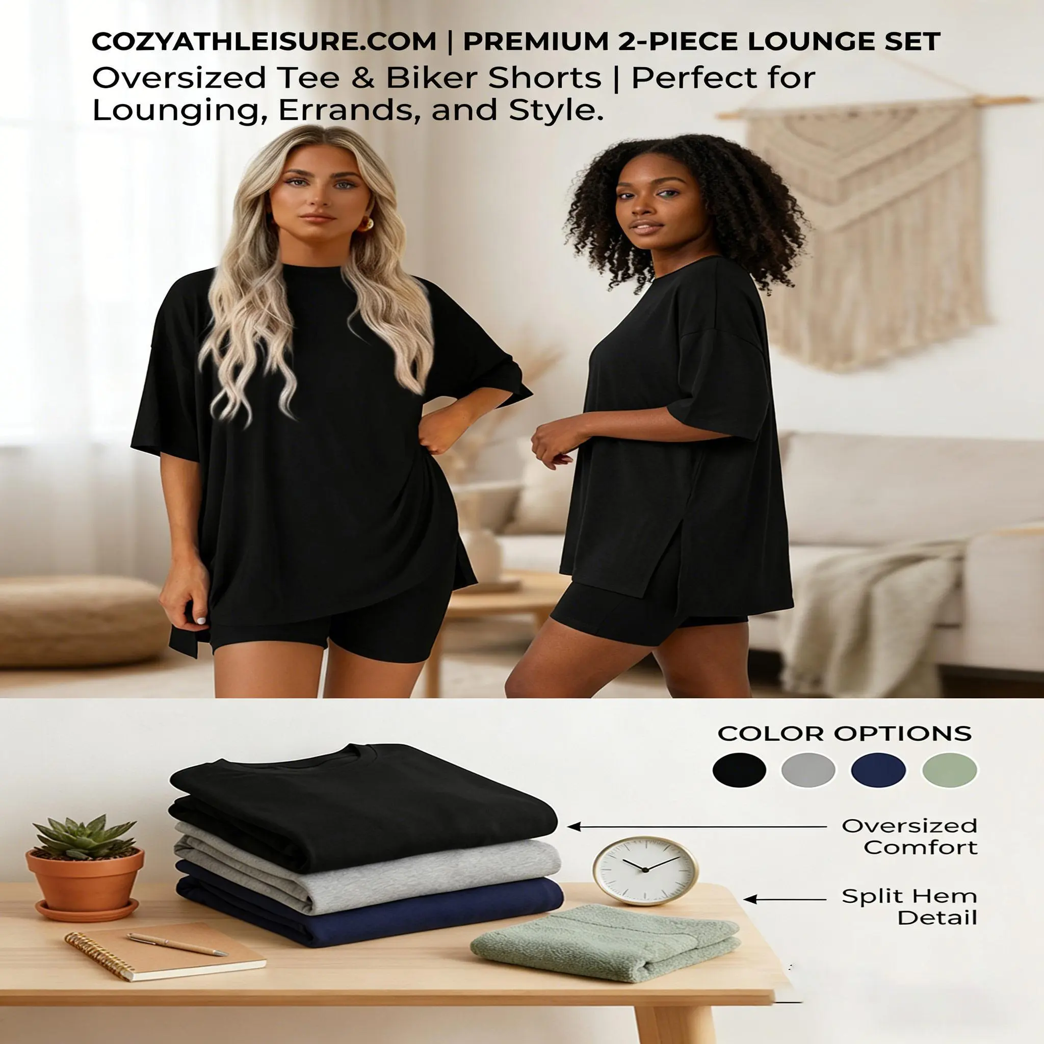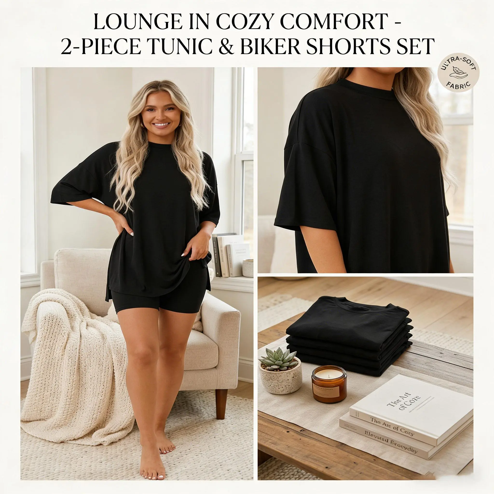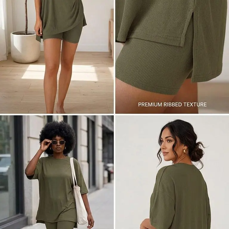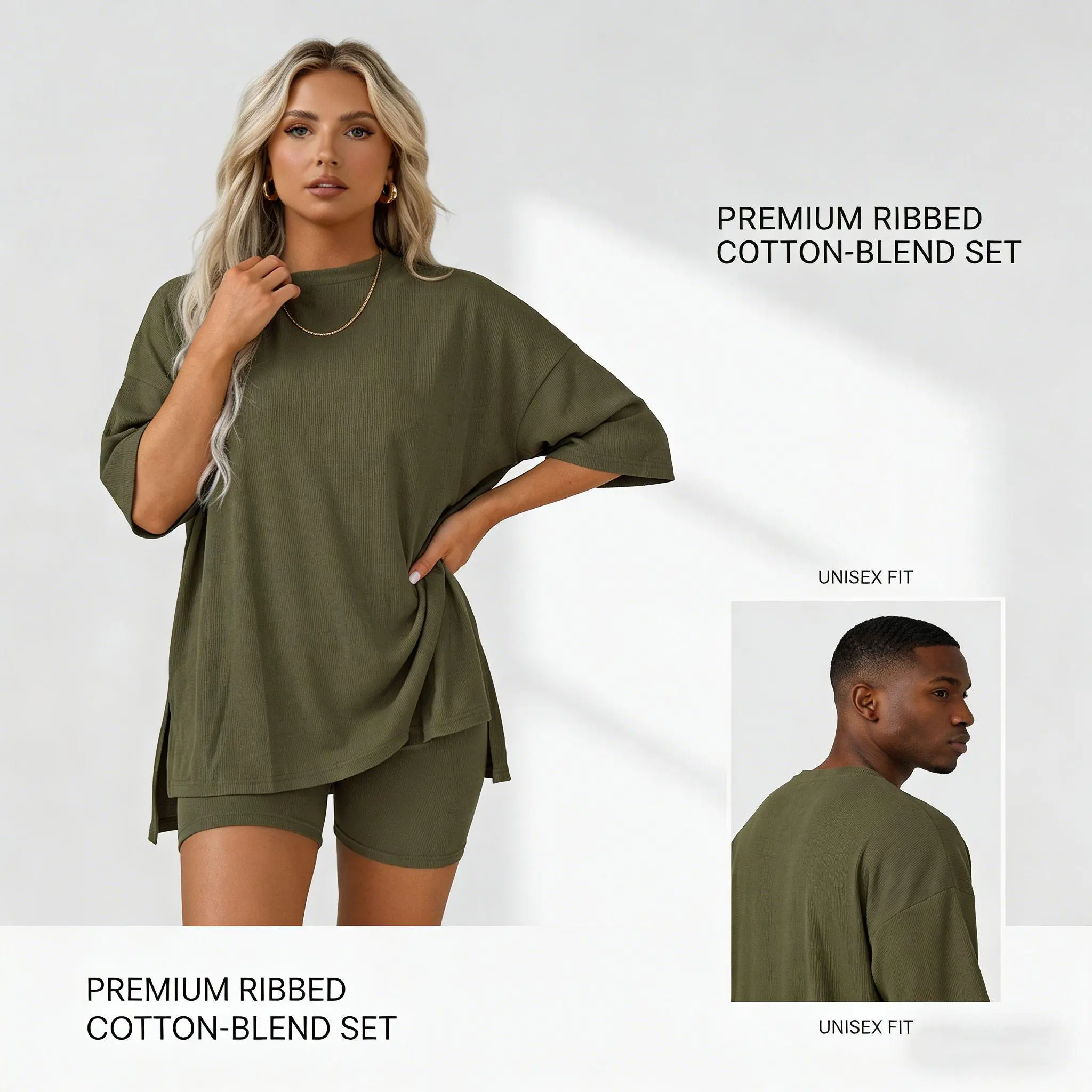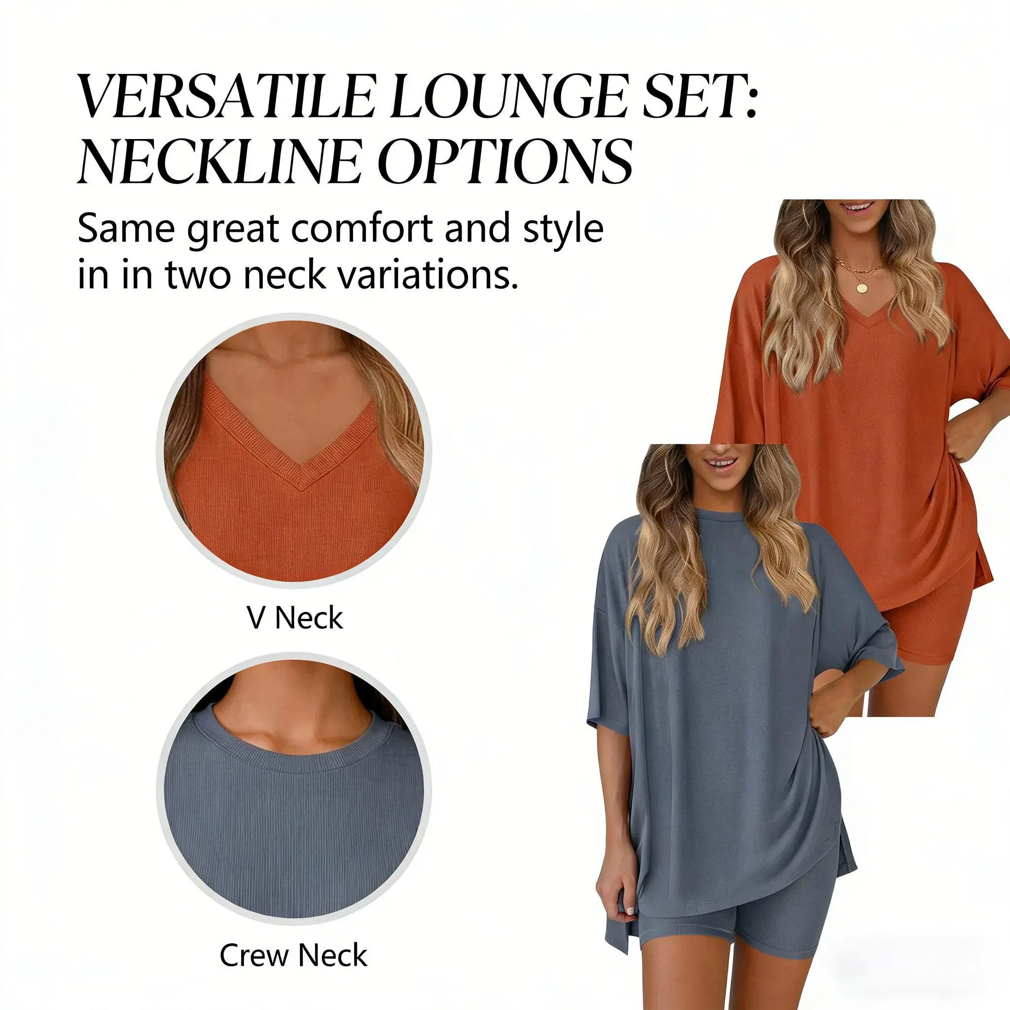 Women’s summer crewneck two-piece loungewear set, ideal for home relaxing. Features an oversized split-hem top and biker shorts with side pockets. Made of soft viscose, it’s lightweight and easy to care for.