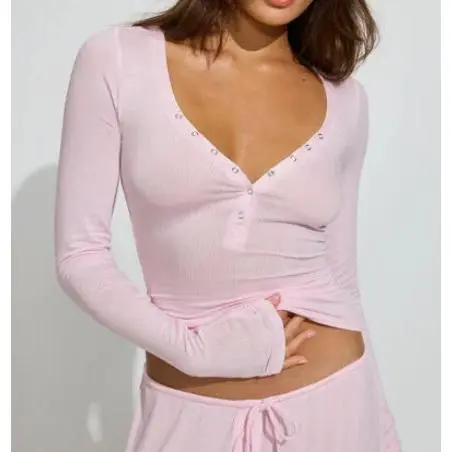 Women Solid Ribbed Henley TopsFit Button-up V Neck Long Sleeve Crop Fall Shirts