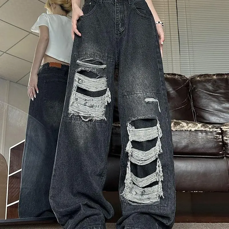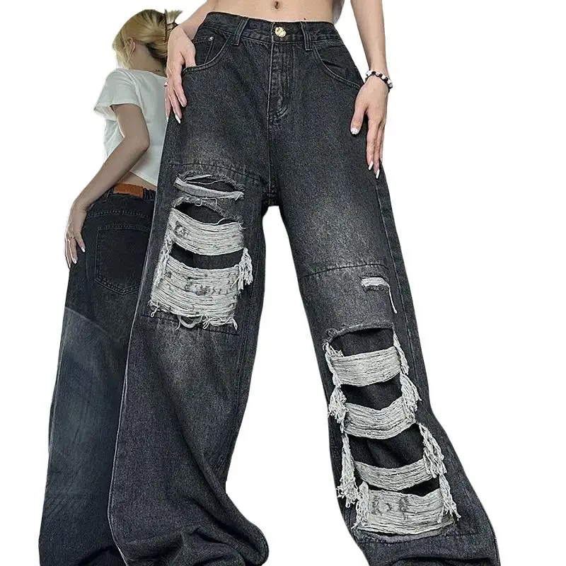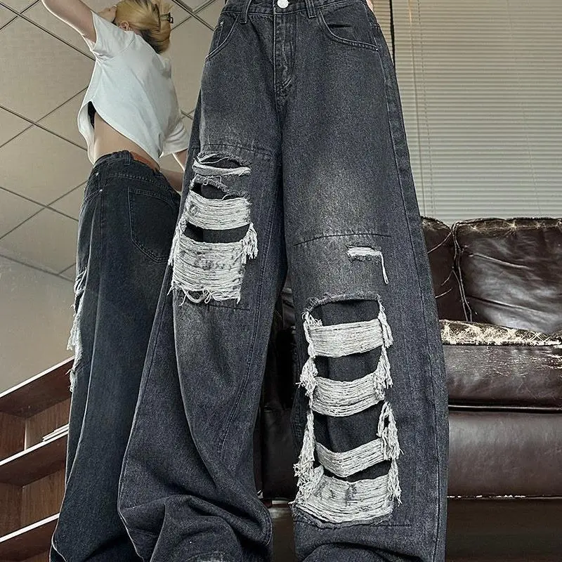 High-Rise Ripped Straight Leg Jeans Loose Fit Distressed Denim with Embroidery Detail Mid-Stretch Fabric Button Hole at Waist Machine Washable Casual Streetwear for Teens Trendy Outfit Pants Streetstyle Attire Basic Black