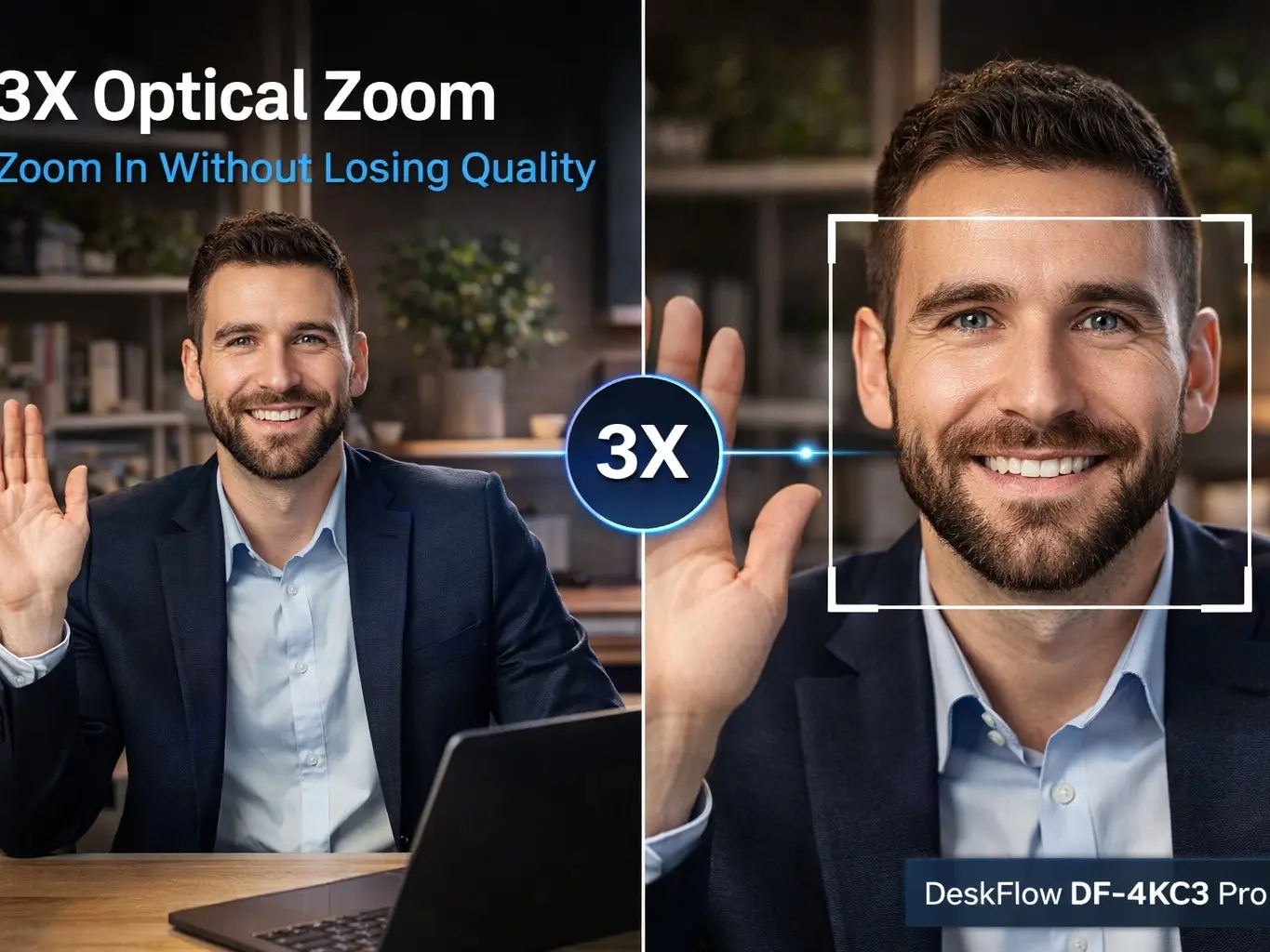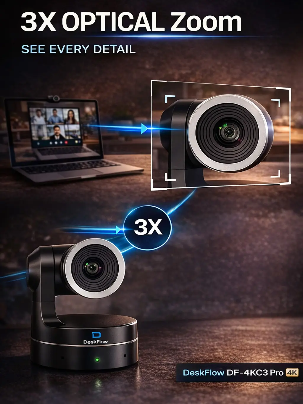 The DeskFlow DF-4KC3 Pro delivers crystal-clear 4K video with 3X optical zoom, so you can stay focused and professional at all times.