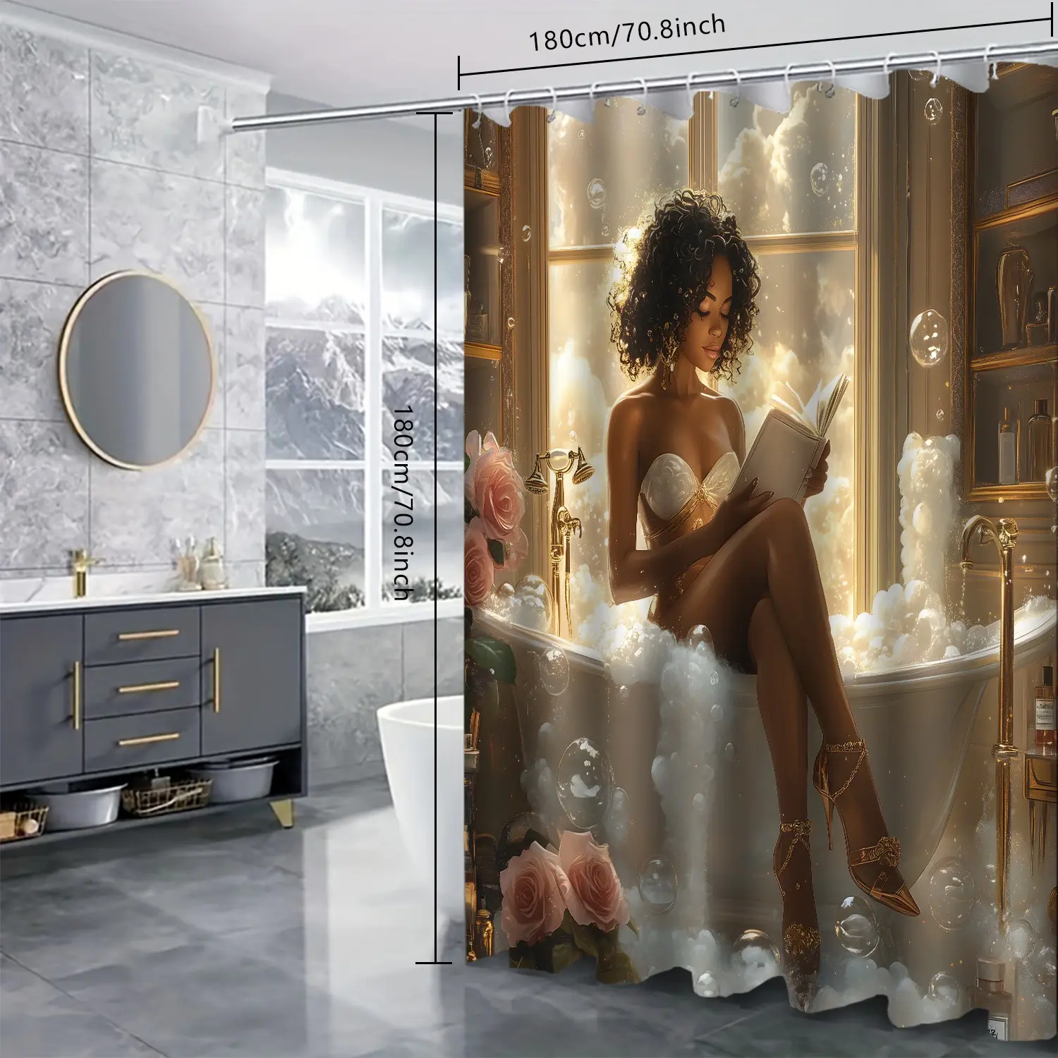 Elevate your bathroom decor with this stunning 4-piece shower curtain set from LVRLVR! Showcasing a luxurious, dreamy design of an elegant lady relaxing in a bubble-filled bathtub, surrounded by golden accents, soft roses, and a sunlit sky view, this set brings a sophisticated, glamorous vibe perfect for anyone who loves opulent, feminine style.