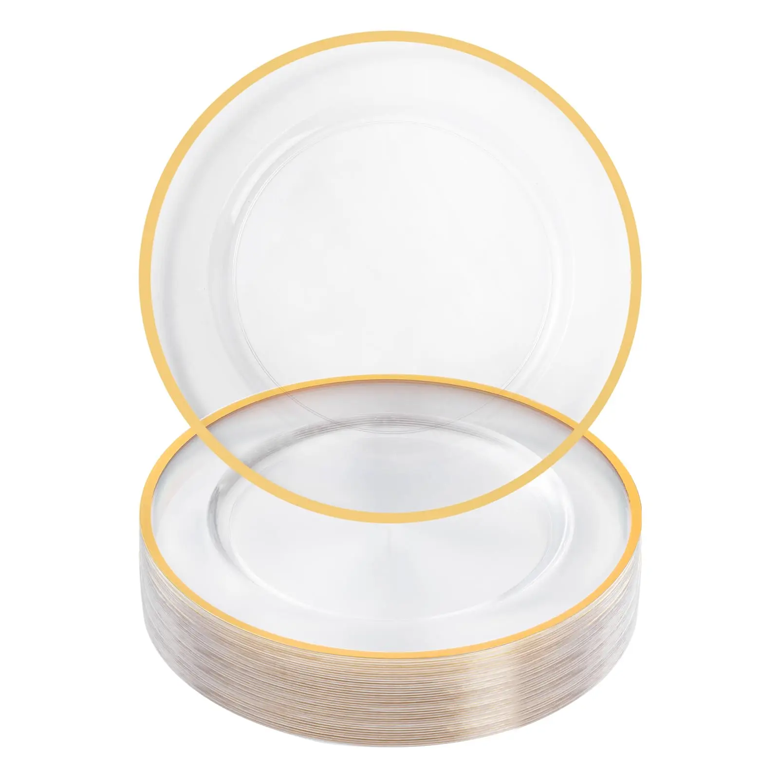 ·PACKAGE INCLUDES - You will receive a set of 15/25/50 clear charger plates with gold rim, each measuring 12 inches. Add elegance and glamour to the events you host with these stylish gold charger plates, perfect for receptions and banquets. NOTE: These plastic plates are not recommended for use in the microwave or dishwasher.