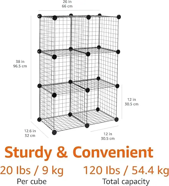 6-Cube Wire Grid Stackable Storage Organizer, Metal Shelving Unit, No-Tool Assembly, 26"W x 38"H x 12.6"D, Black