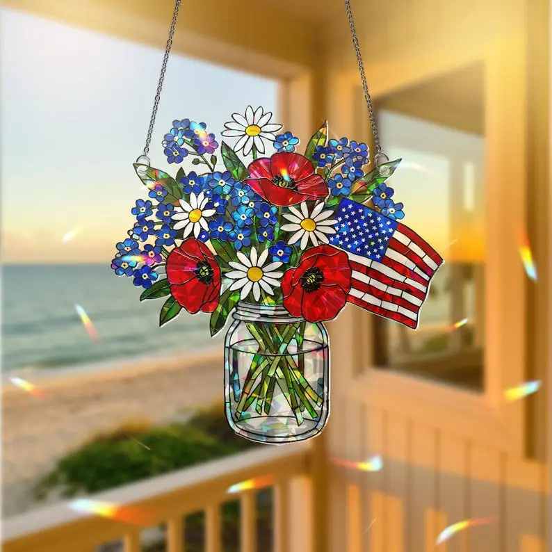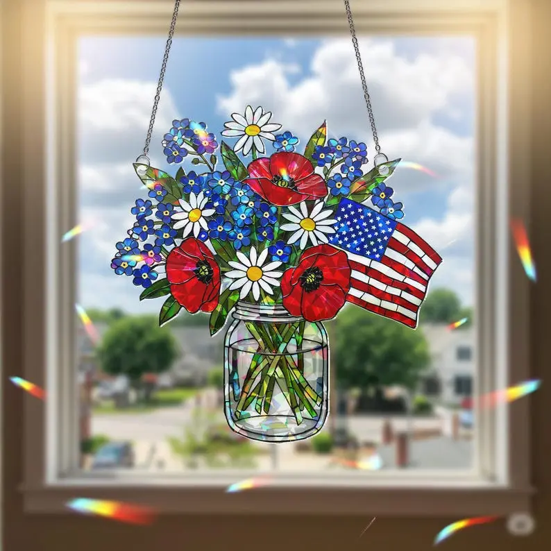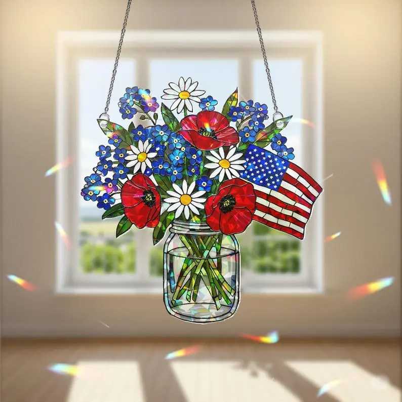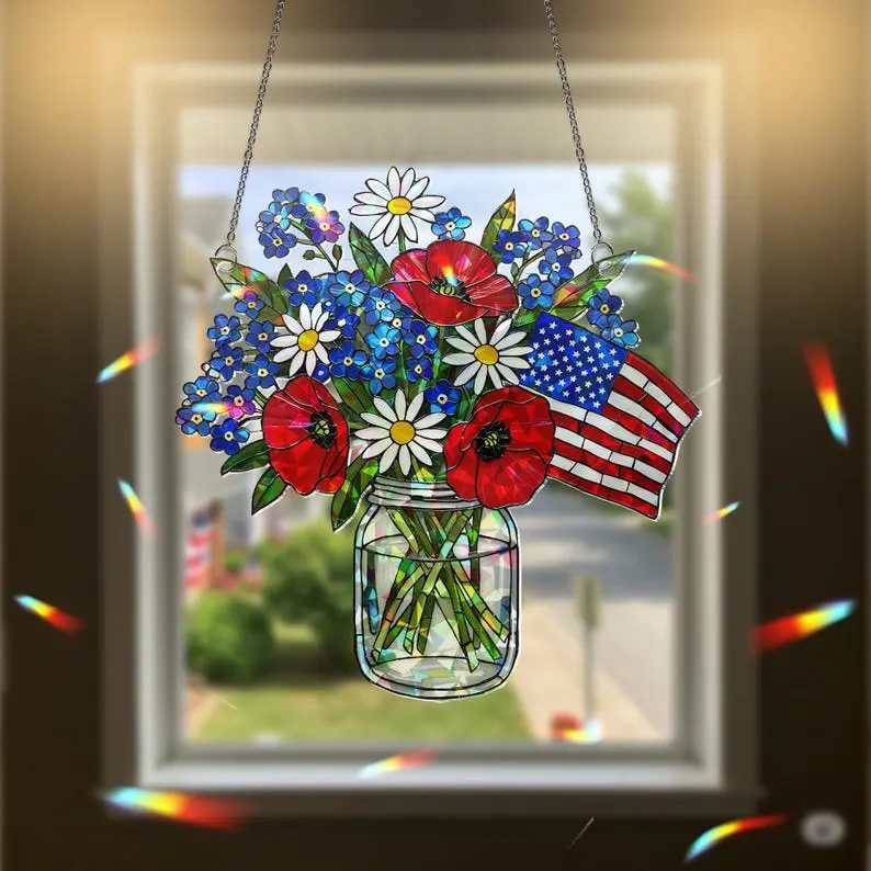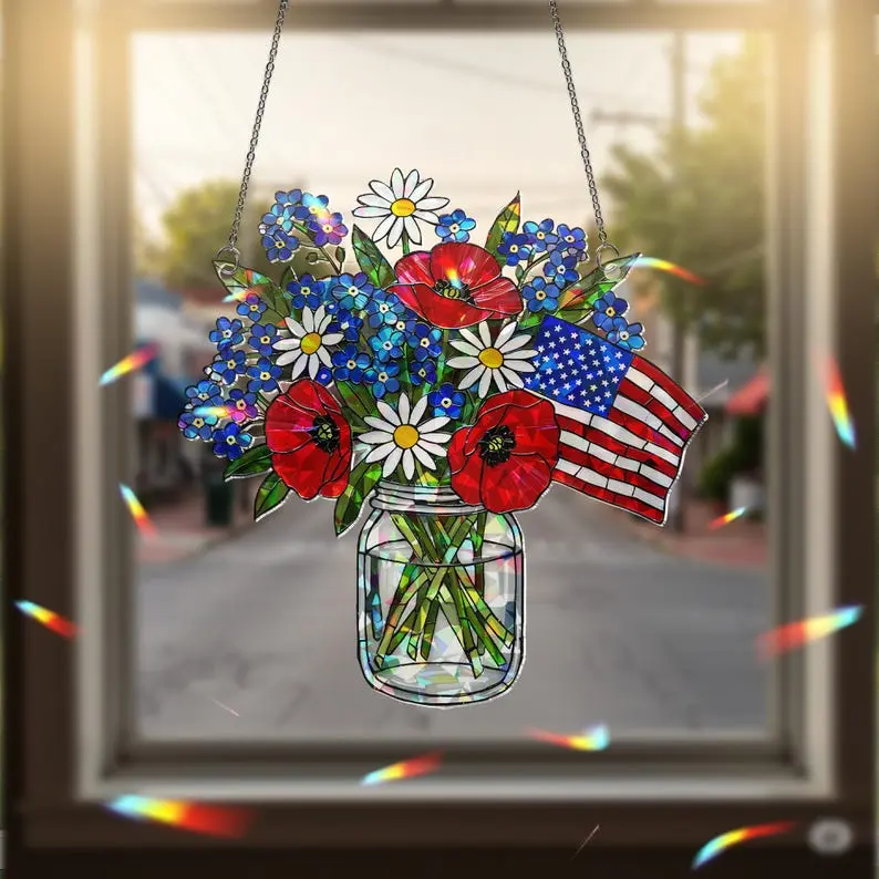 Patriotic Flower Suncatcher, Holographic Acrylic Flag Jar Art, American Flag Window Hanging, USA Sun Catcher, 4th of July Decor, Patriotic Home Decor
