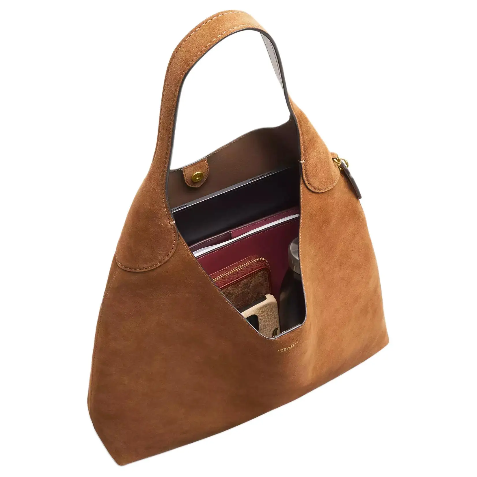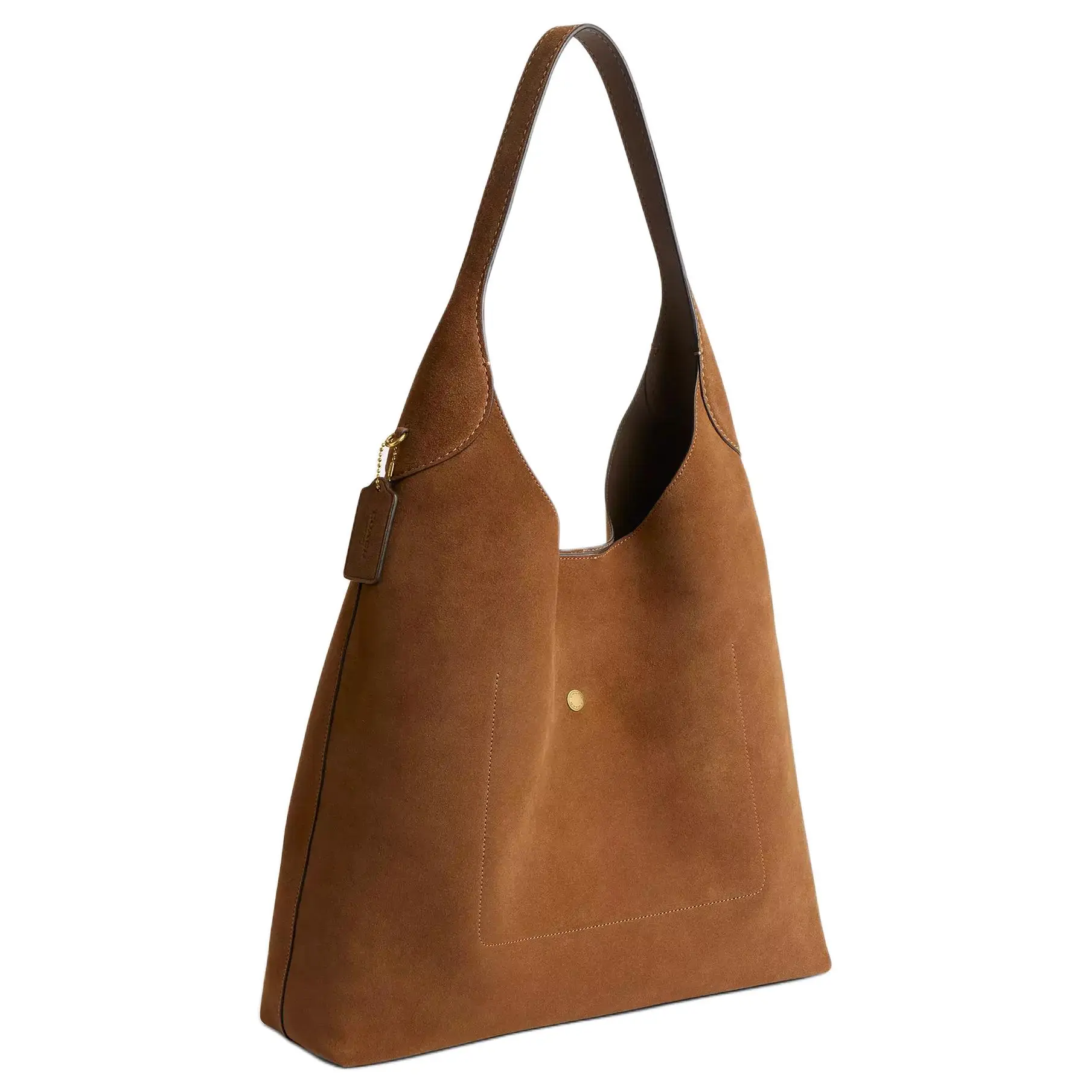 Materials: Premium pebbled suede (velvety nubuck finish), reinforced with smooth leather trim and polished nickel hardware. Lined with durable, COACH-branded textile.