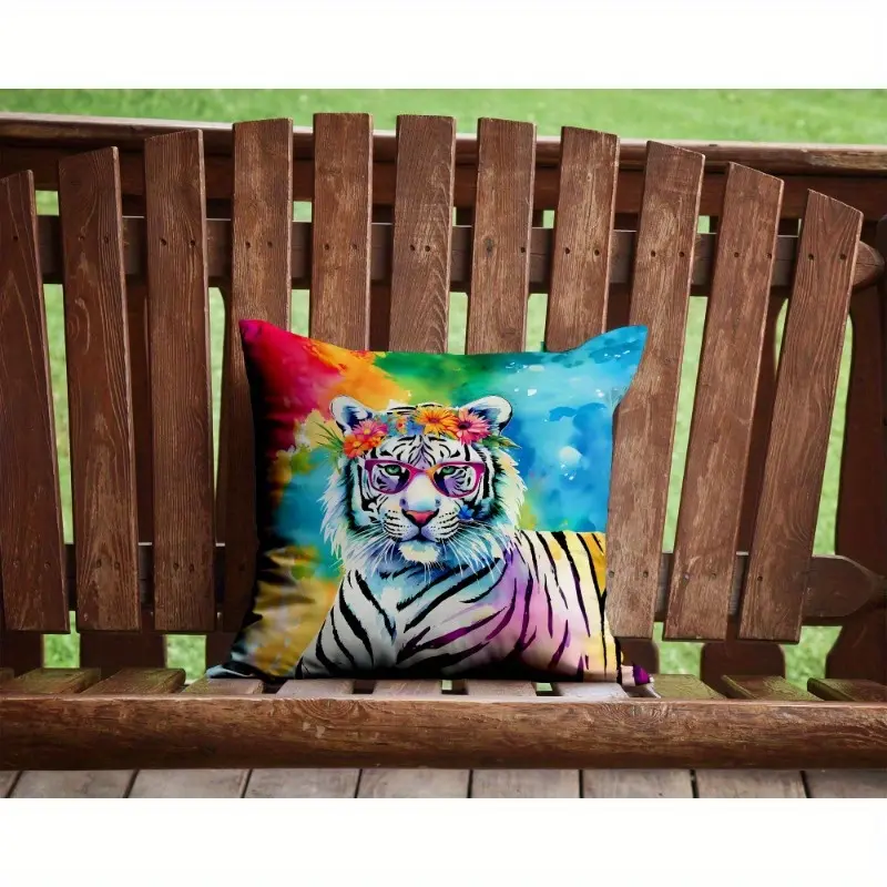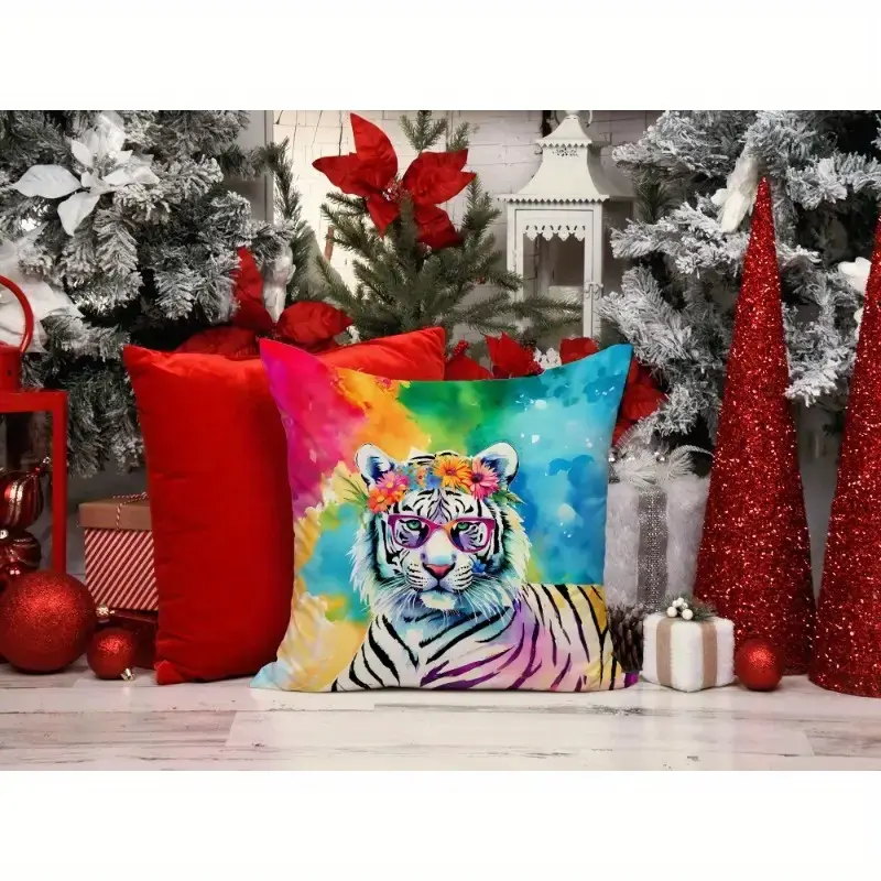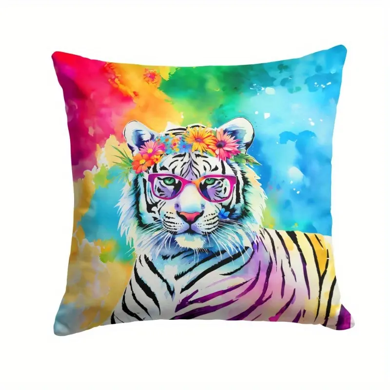 Single-sided printed vintage hippie-style white tiger pillow, washable indoor and outdoor decorative cushion, featuring a design with a flower crown and stylish glasses, suitable for sofas, beds, and patios