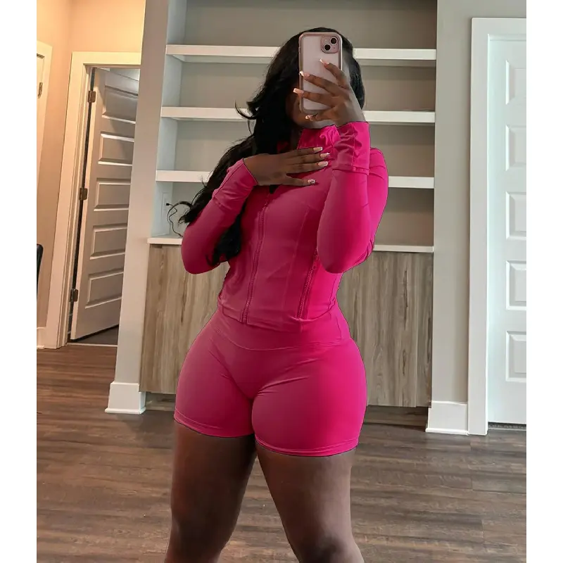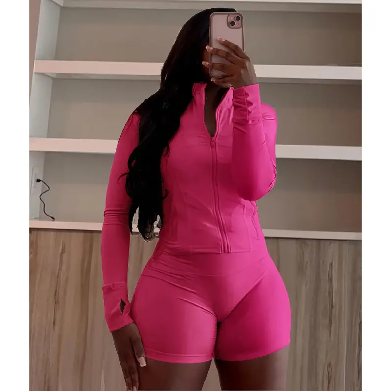 Workout sets for women 2 piece feature: solid color, long sleeve jackets, full zip up, thumbholes, sweatshirt tops, skinny legging shorts, high waist, with 2 side pocket, 2 piece outfits for women