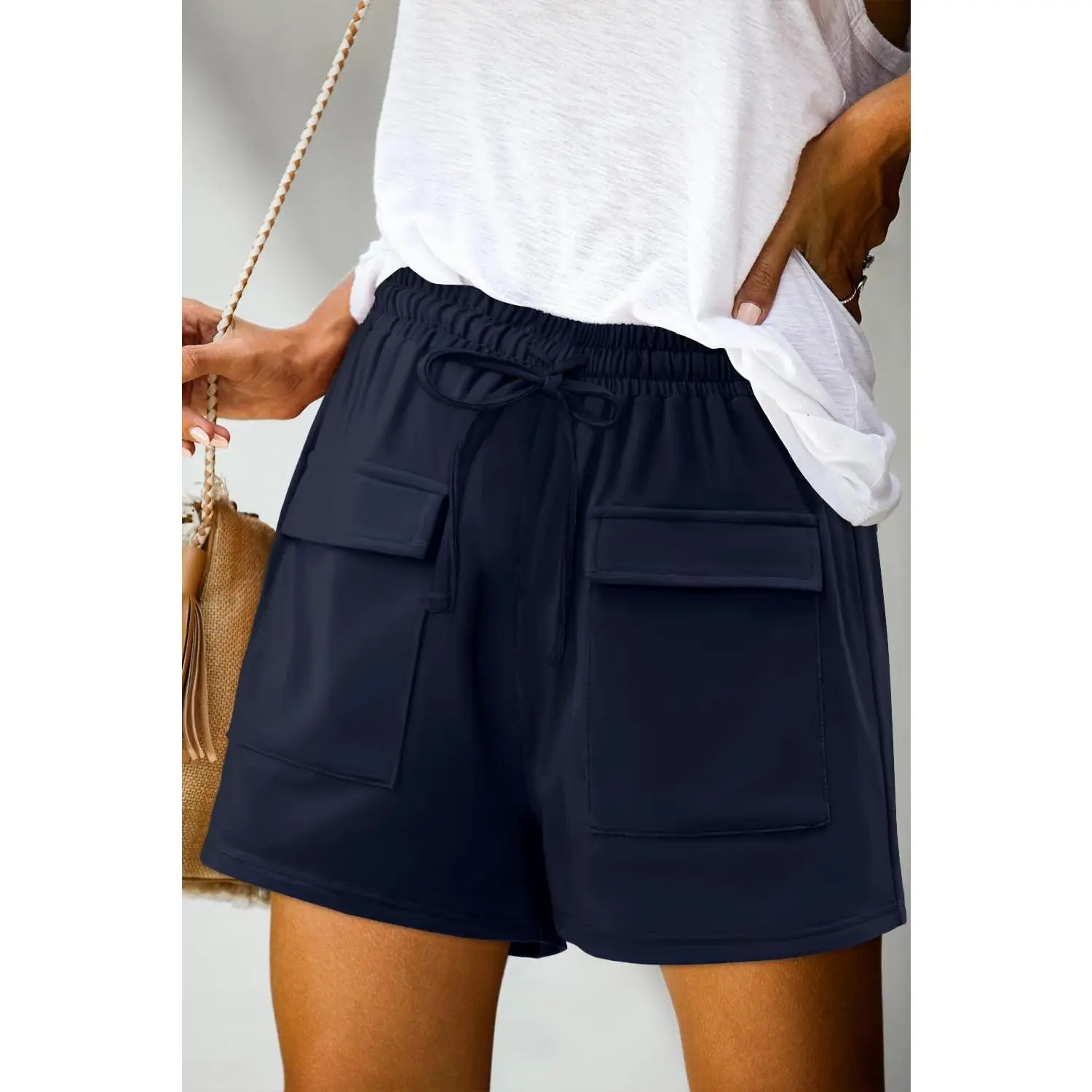 Design:Mid-rise elastic waistband for stretchy fit,Pockets in sides,Adjustable waist drawstring,Wide and comfortable short legs can give you the perfect wearing experience