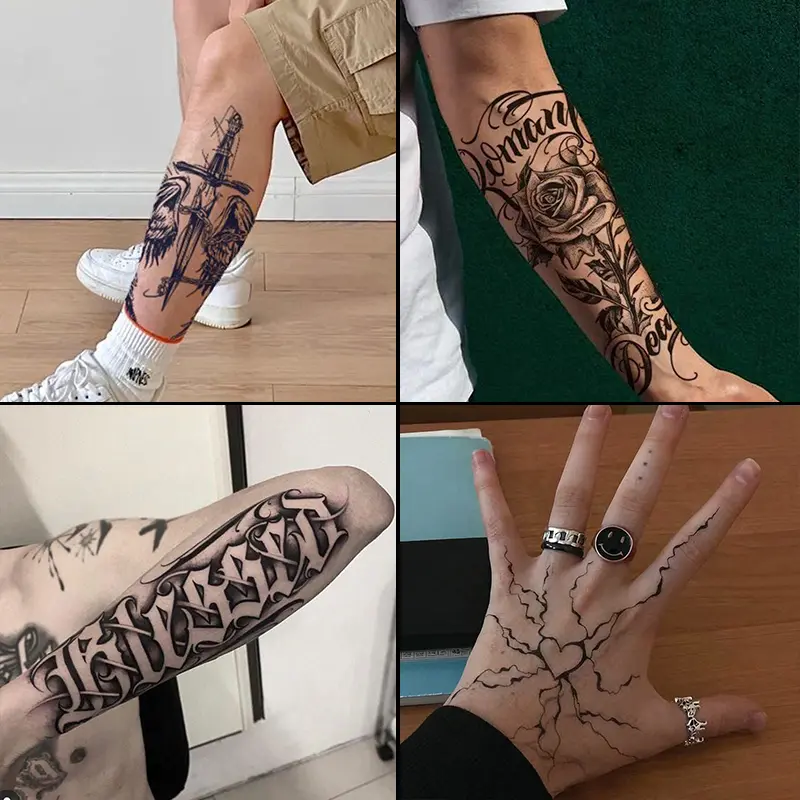 Four large herbal tattoo stickers, including floral lettering designs; lasting 7–15 days, waterproof and abrasion-resistant, realistic effect; suitable for those who don’t want tattoos but are sensitive to pain.
