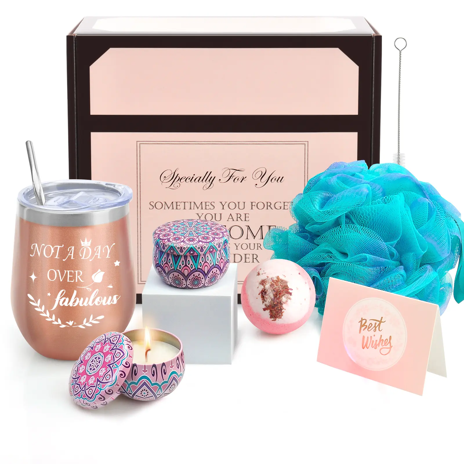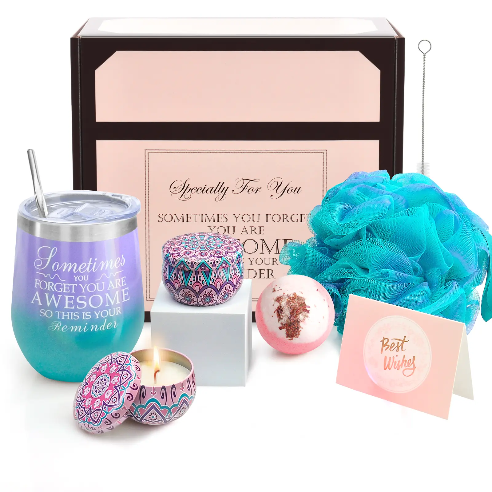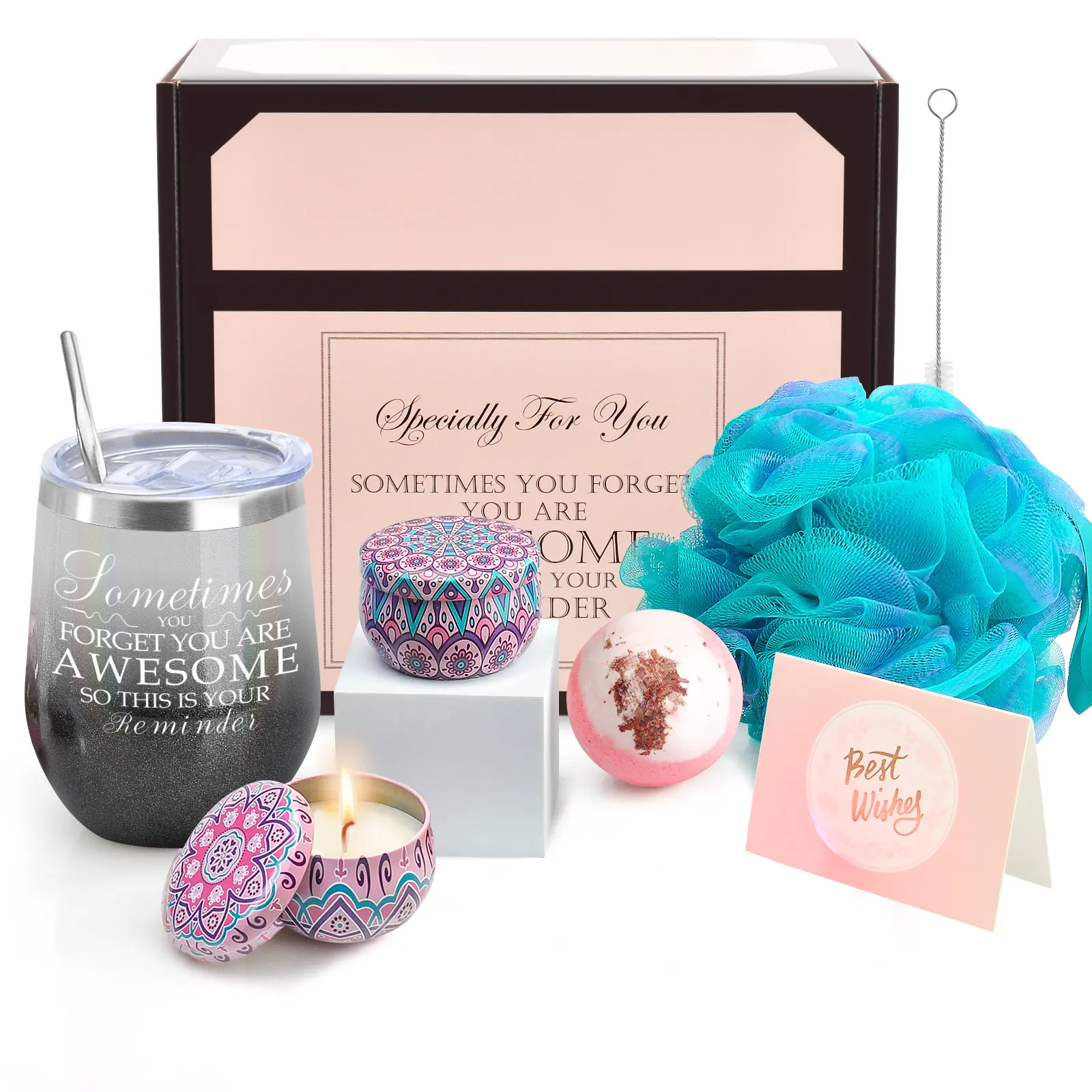 "Sometimes You Forget You Are Awesome" / "Not A Day Over Fabulous" Self Care Spa Gift Set, Insulated Tumbler with Candle, Bath Bomb, Gifts for Men Women, Mom Dad, Birthday Christmas