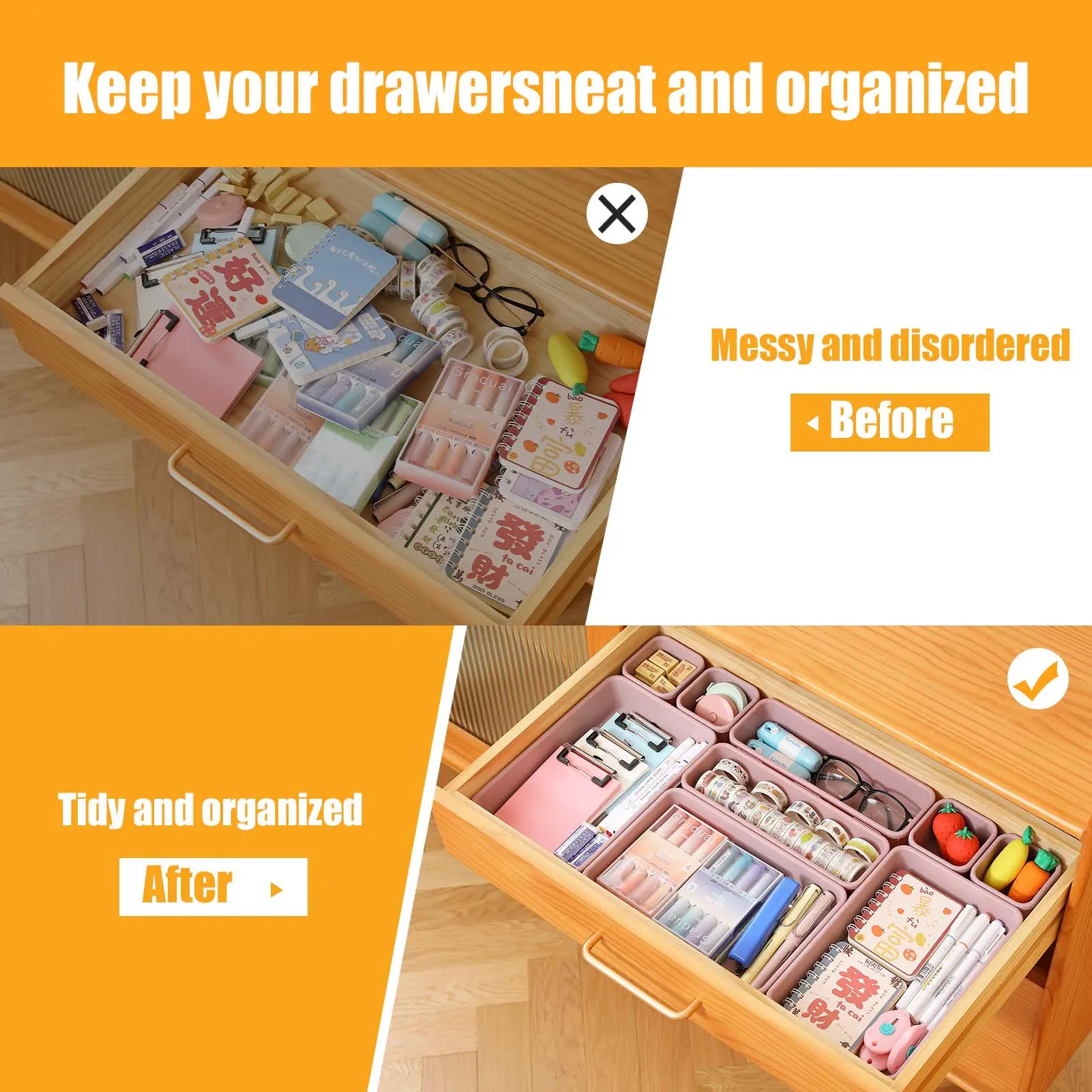 This set includes 4 different sizes of lightweight storage bins, perfect for various spaces. Ideal for kitchen, bathroom, makeup, and office use. Each bin is designed to fit neatly into drawers, maximizing storage efficiency. The plastic material ensures durability and ease of use.