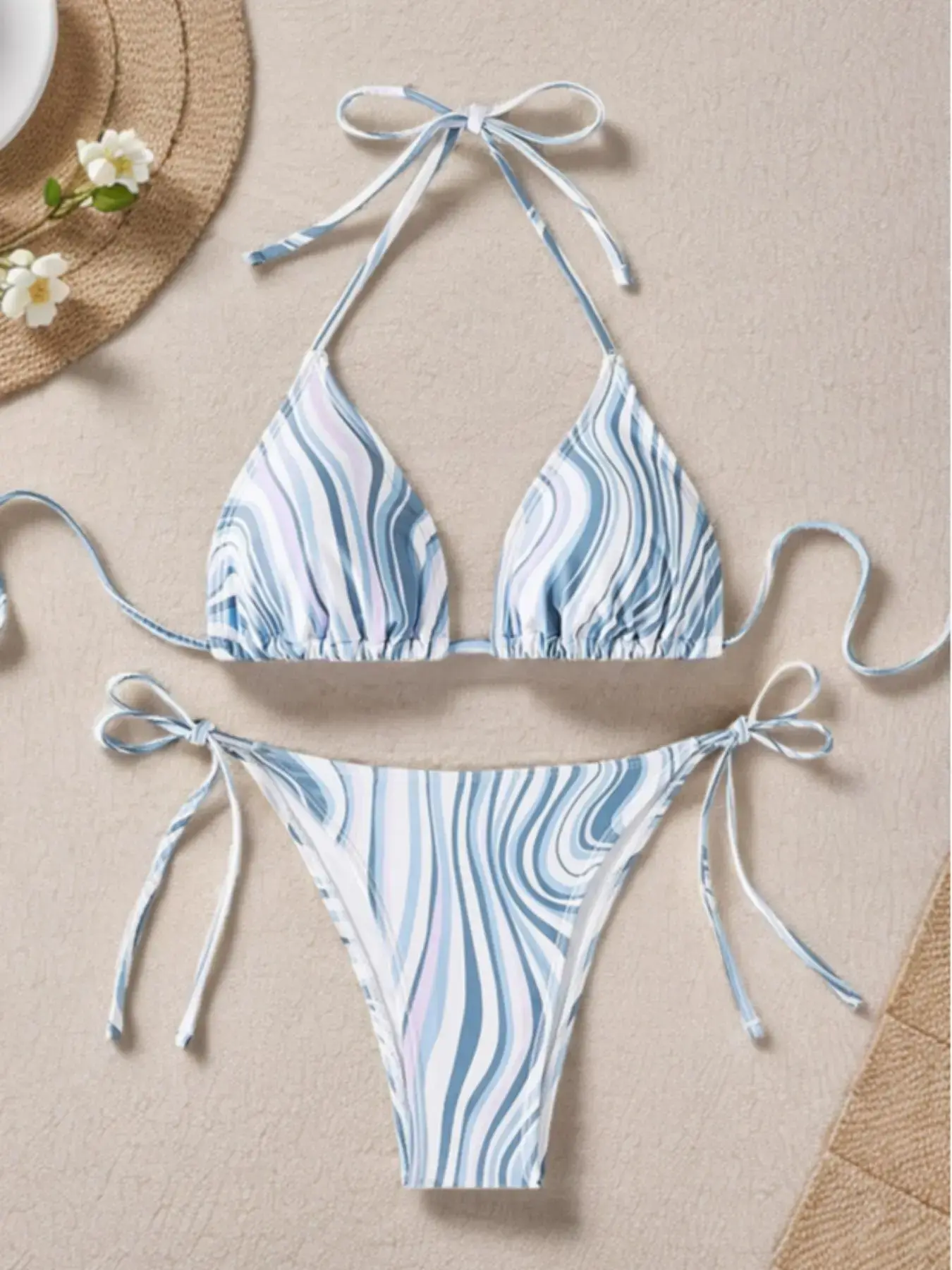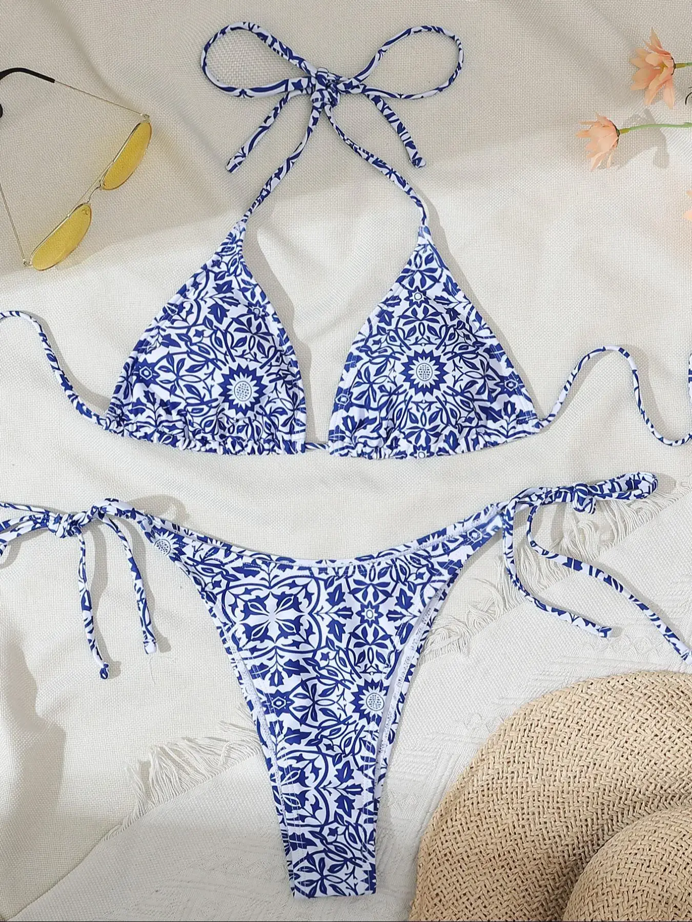 ·【Stylish Design】: This bikini set features a halter neck and backless triangle swim bra, paired with a tie-side swim thong, creating a trendy and chic look for the beach or vacation.