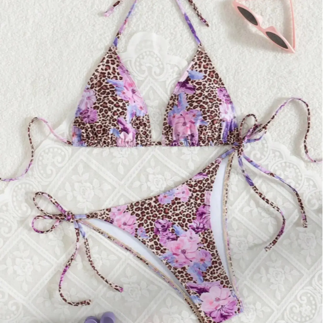 Women's Leopard Print Tie Back Bikini Set, Halter Neck Swim Top & Thong Swim Bottom, Ladies Swimsuit for Beach Holiday Vacation, Swimsuit Style Bikini, Leopard Print Bikinis
