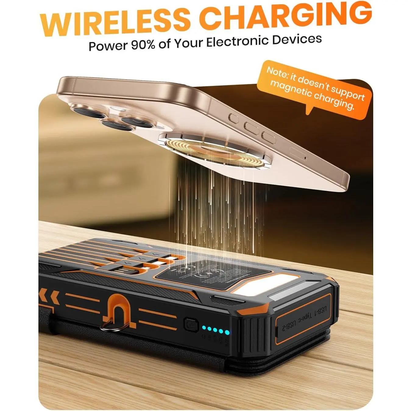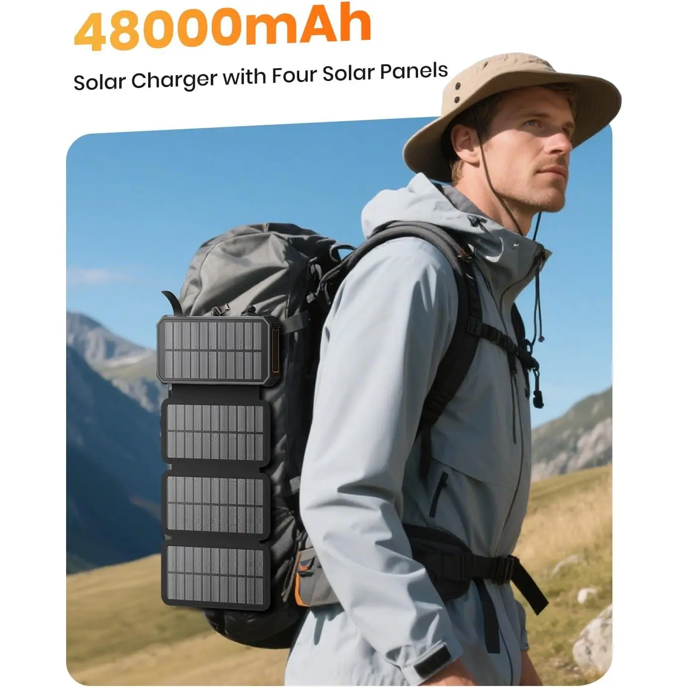 Upgraded High-Efficiency 4 Solar Panels: Equipped with 4 premium solar panels, this solar panel charger charges up to 7 times faster than standard single-panel chargers. It enables direct solar even in outdoor settings-keeping your devices with green energy anytime, anywhere. Massive 48000mAh Solar Power Bank: Featuring a high-capacity 48000mAh lithium-polymer battery, this solar charger offers enhanced safety and extended battery life-delivering up to 80% more cycles compared to traditional batteries. for long outdoor adventures. Built-in 4 Cable for Multi-Device Compatibility: Designed for multi-device, this portable solar battery bank includes 3 ports (2 USB-A outputs, 1 Type-C input/output), 4 built-in cables (USB-C, iOS, USB-A, Micro), and a wireless pad-supporting up to 7 devices at once. Wireless for Cell Phone: No need for cumbersome cables, simply place your phone in the wireless pad and it gets quick charged immediately. Compatible with all wireless devices. Such as IPhone 16/15/ 14/13/12 series, Galaxy S24 /S23/S22/S21 series and so on. 3A Fast: The upgraded 5V/3A Type-C port delivers rapid-boosting your IPhone from 15% to 60% in just 30 minutes. Compatible with 99% of devices on the market, including smartphones, tablets, and Galaxy models.