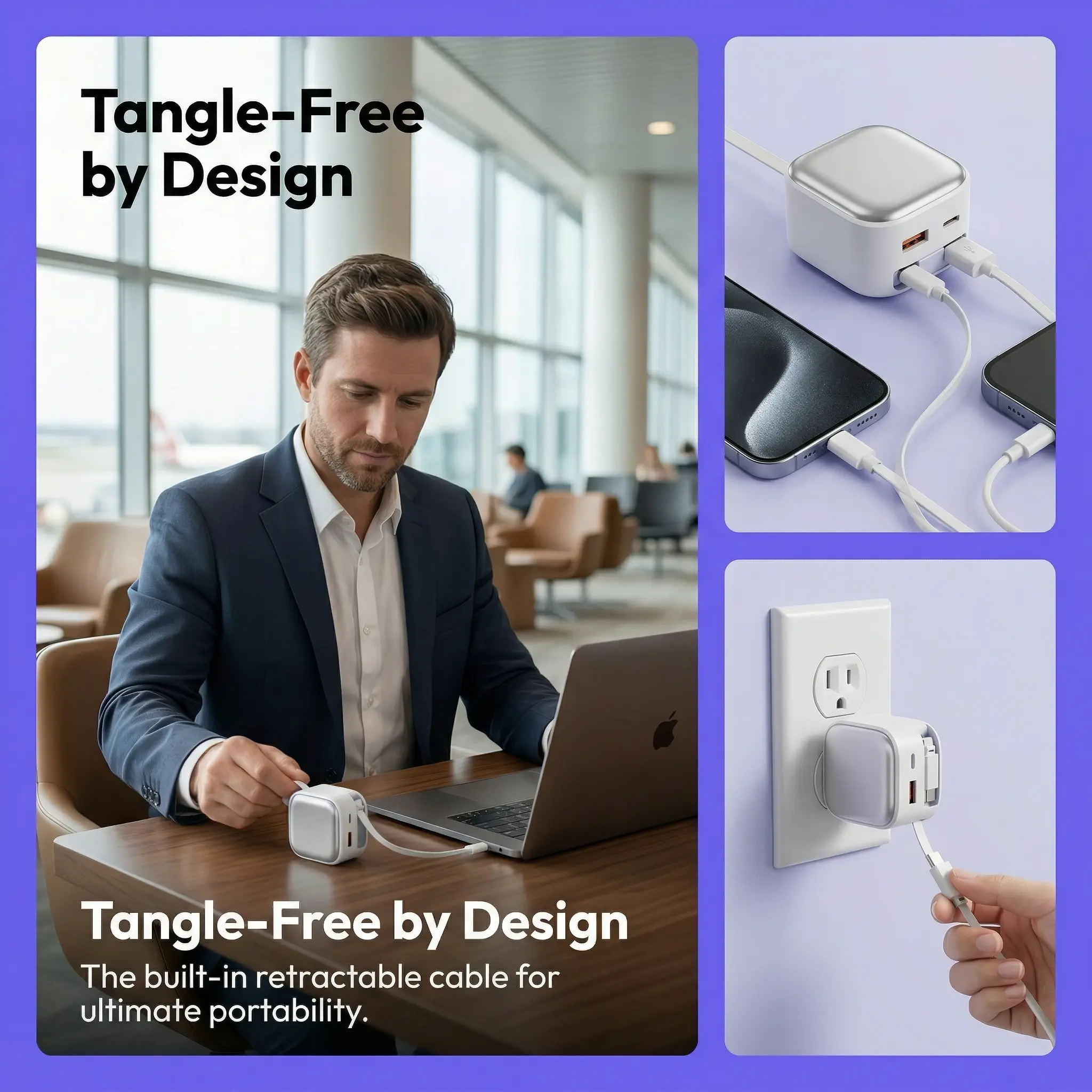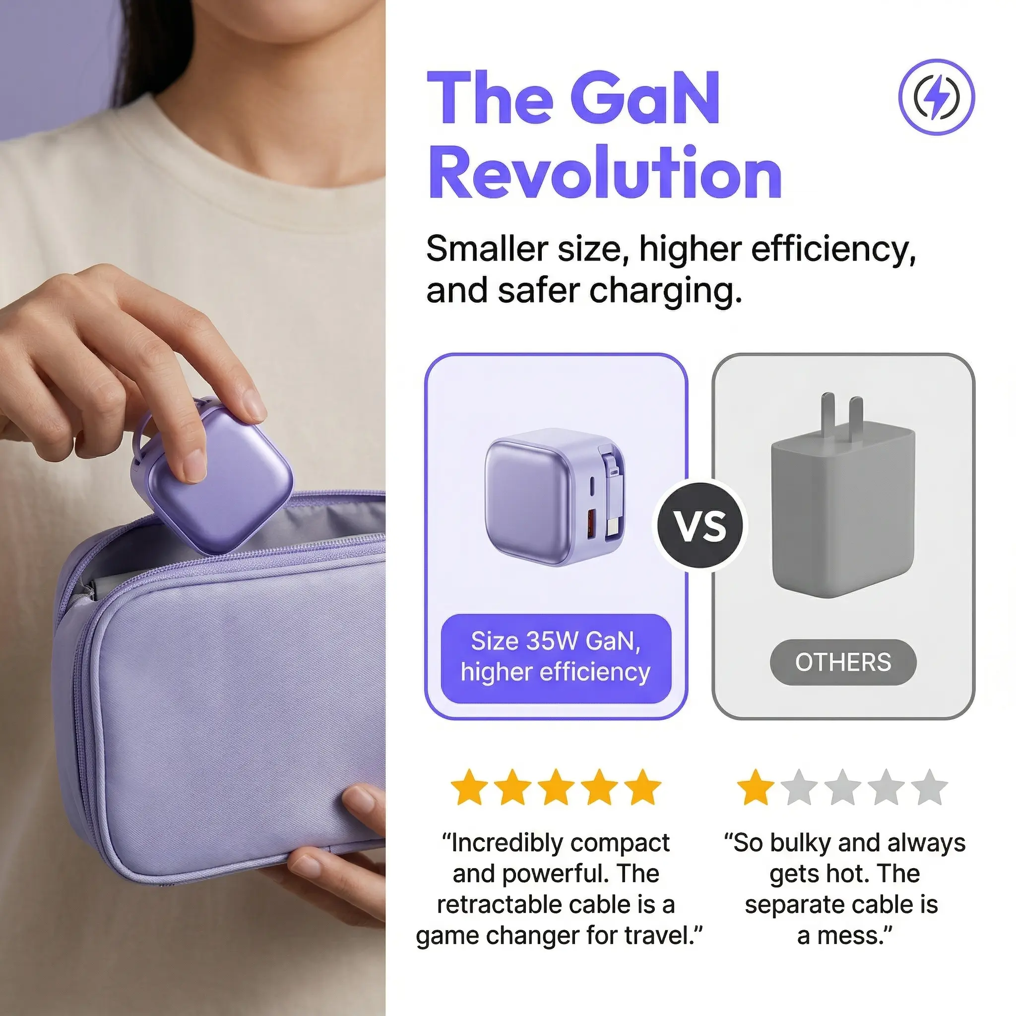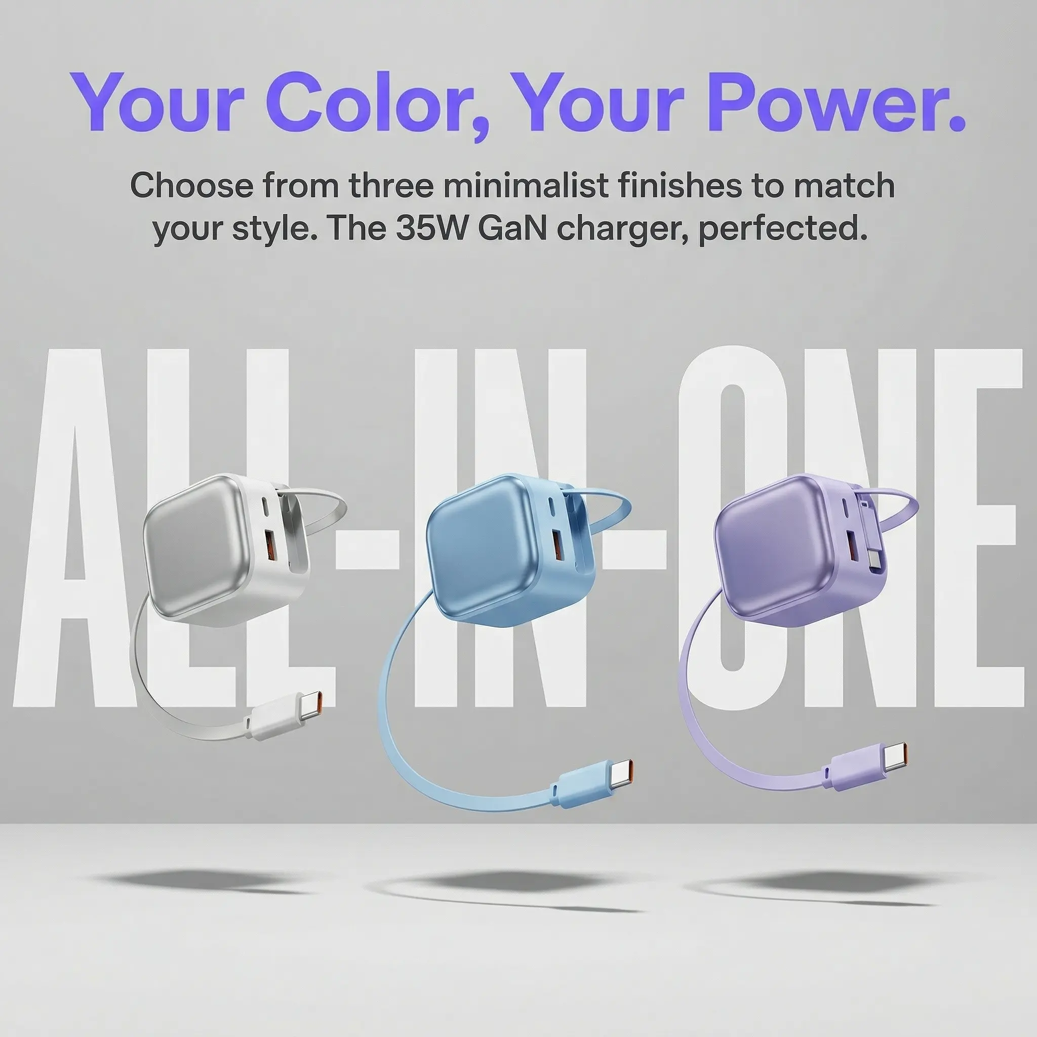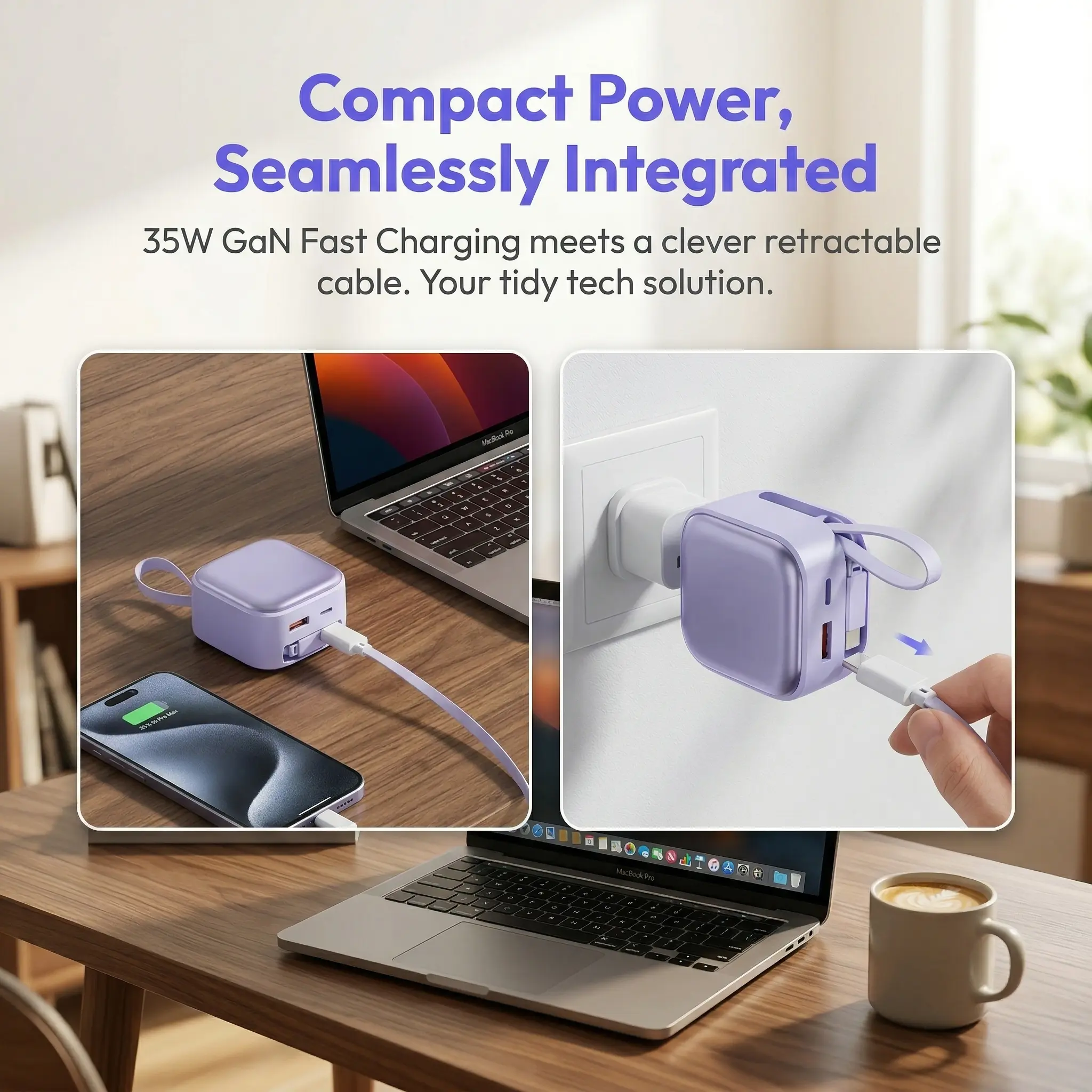Equipped with GaN (Gallium Nitride) Technology, it supports 35W high-speed fast charging. The built-in retractable fast-charging cable completely eliminates cable tangling issues. Featuring dual charging capability, it can power two devices simultaneously, protecting battery health for safer use.