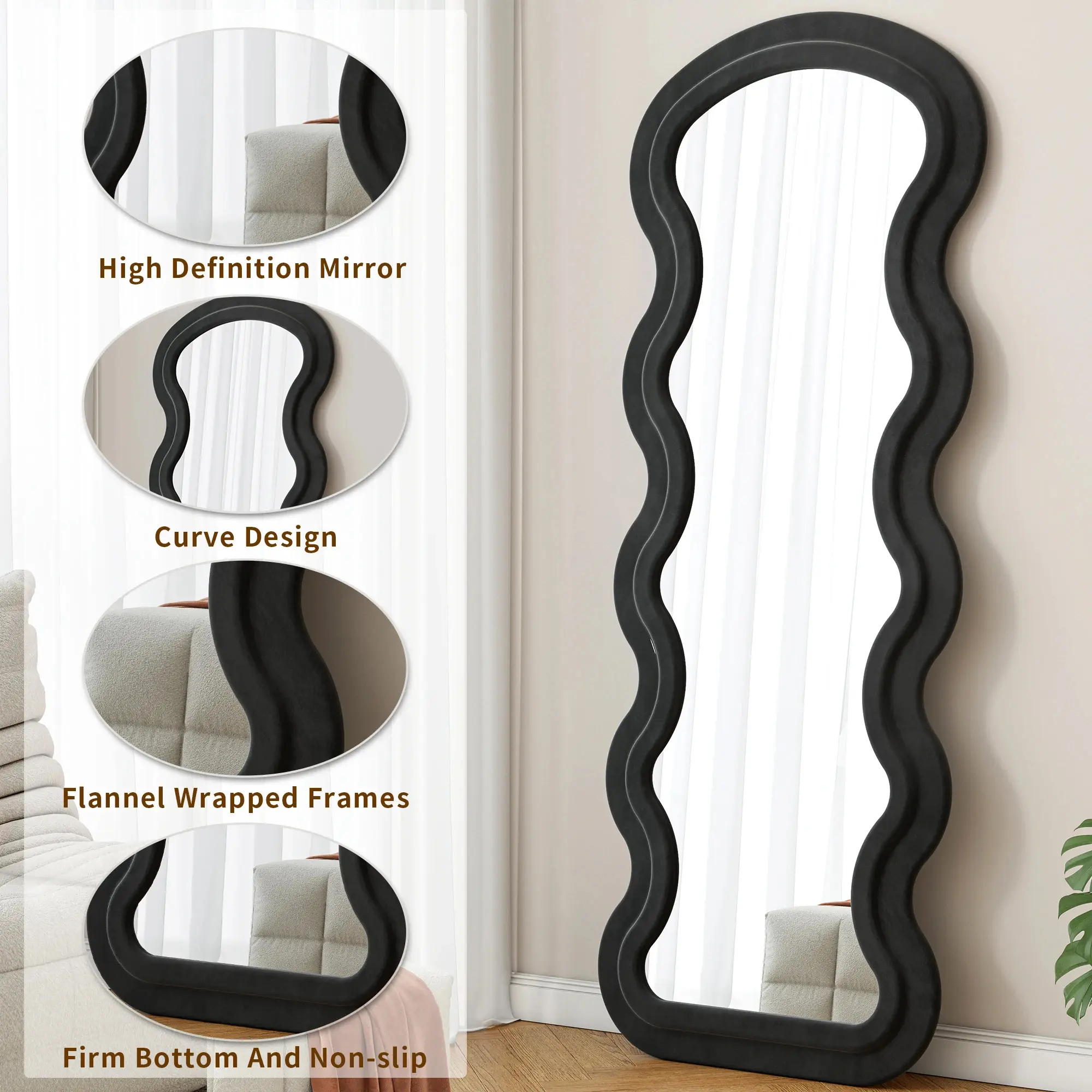 Comfortable Flannel Fabric Touch Full Body Mirror Length Wave Wood Frame Mirror for Living Room Bedroom Wall Cloakroom Gift