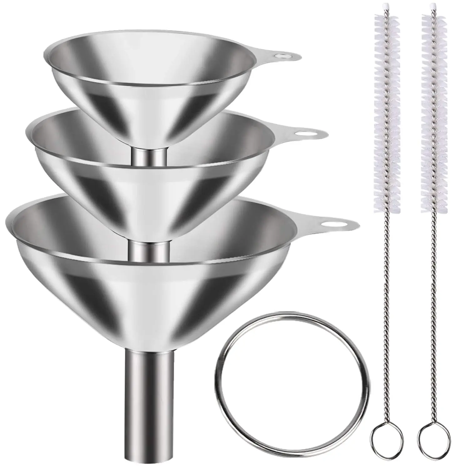 ·Set Includes: Large, medium, and small funnels (3 pcs), 1 metal ring, and 2 cleaning brushes.