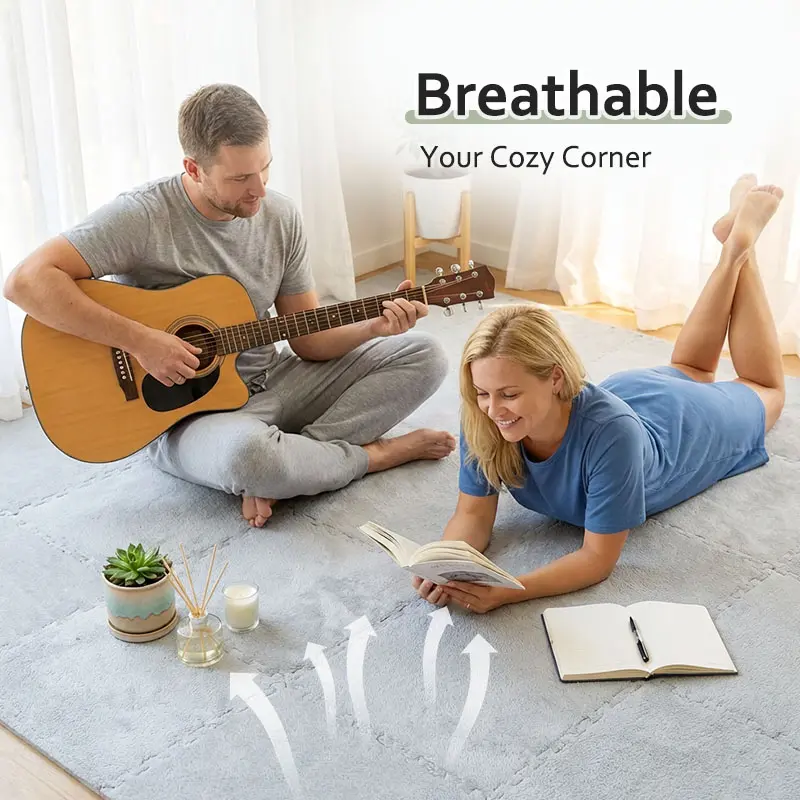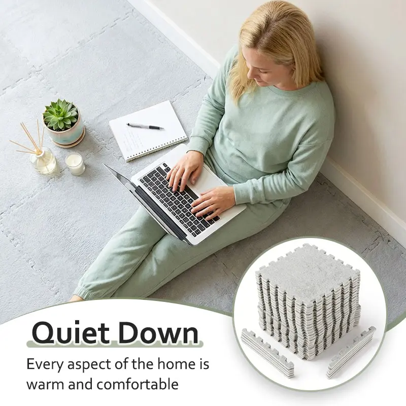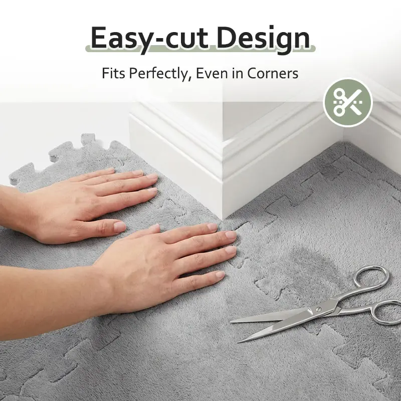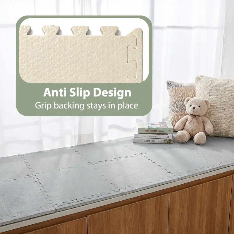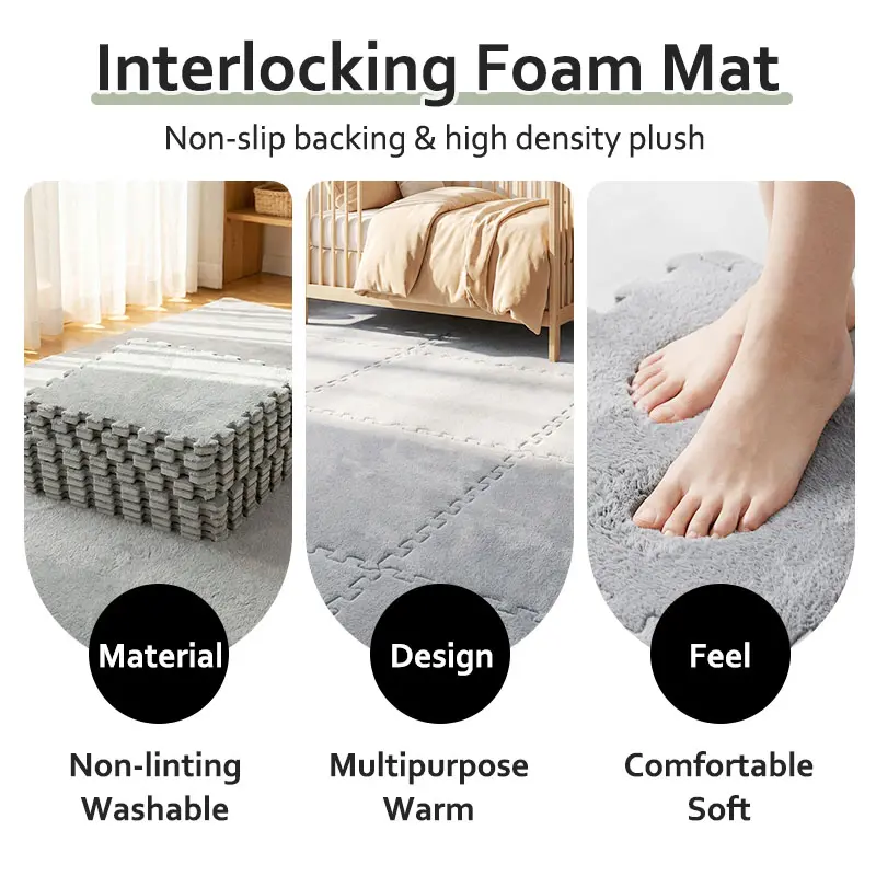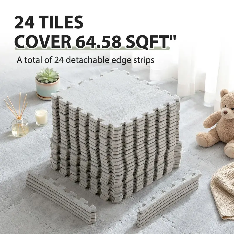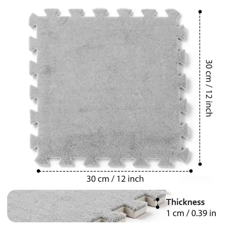 ✨ 23.25 SQ FT Interlocking Carpet Shaggy Soft EVA Foam Mats are ideal for children's rooms. These fluffy square tiles offer a thickened plush texture, ensuring comfort and safety. Perfect for exercise and play, they protect floors from wear and tear. Comes in a convenient pack of 24 pieces in grey. Ideal for home parlor, bedroom, or any kids' area.