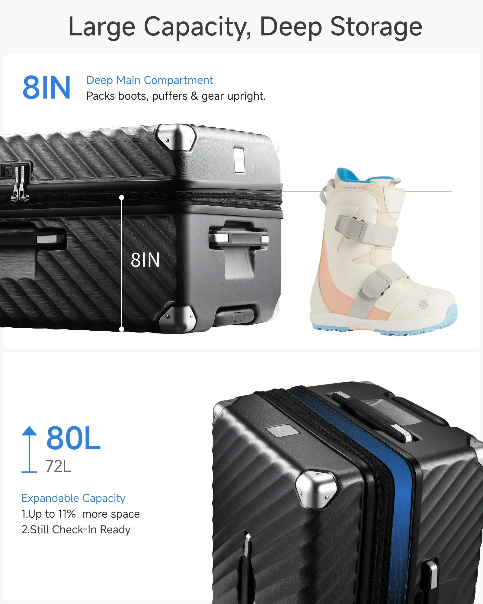 • Deep Compartment for Bulky Items: 3:7 split trunk suitcase design creates a deep compartment ideal for storing large or irregularly shaped items like boots, down jackets, or helmets. Perfect for family trips, long vacations, or international travel where versatile packing is essential.