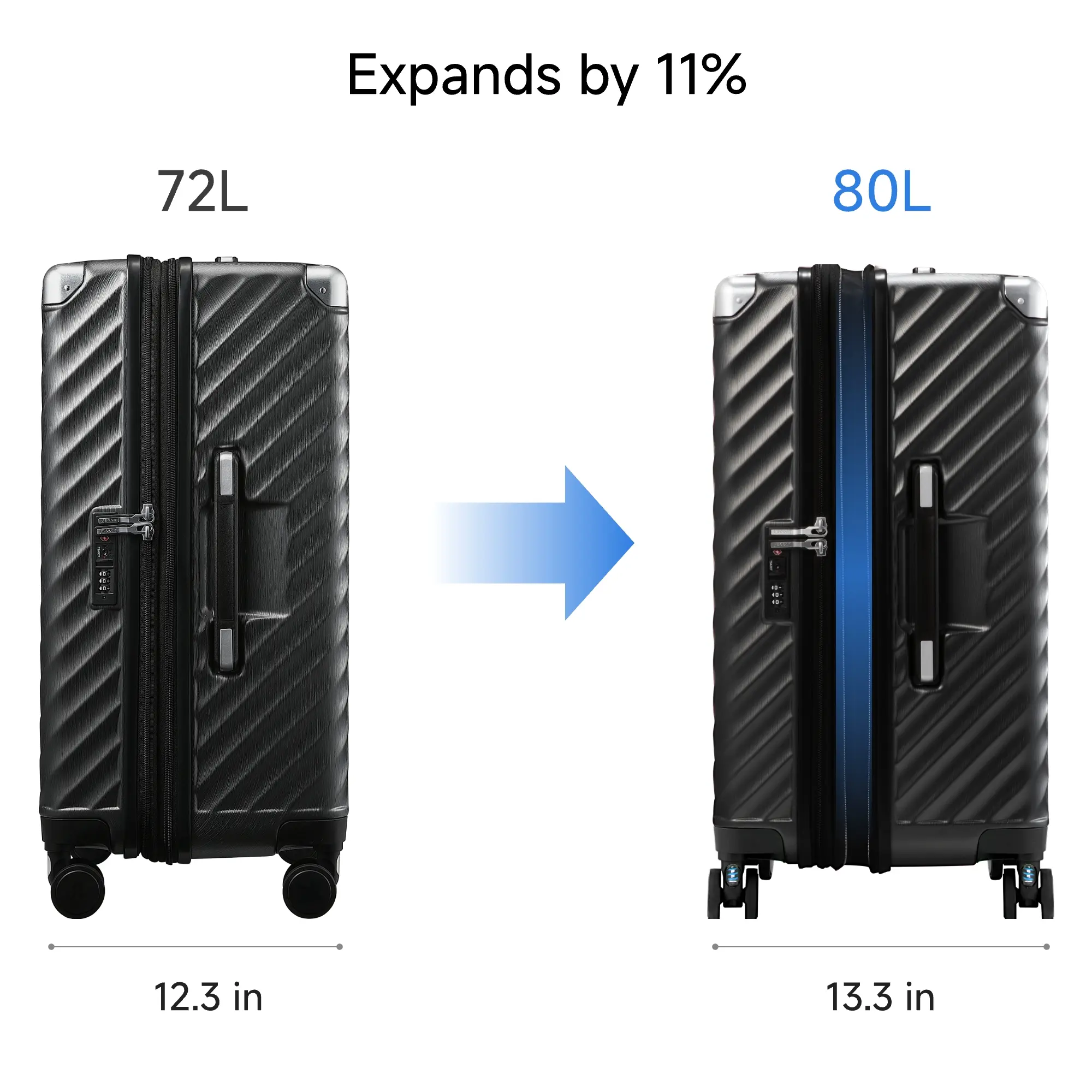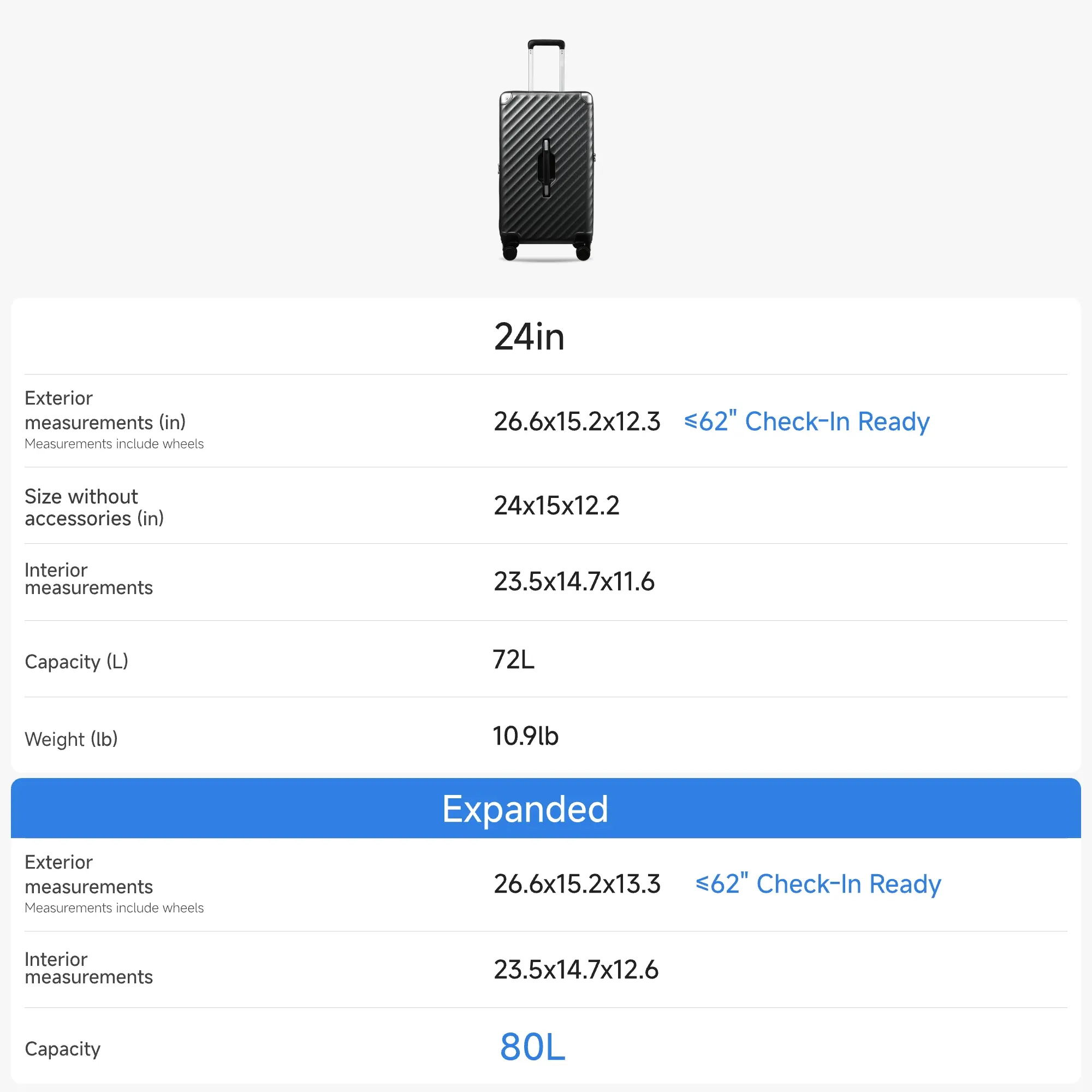 • Expandable Yet TSA-Approved Size: External dimensions including wheels and handles: 26.6×15.2×12.3in (expanded: 26.6×15.2×13.3 in). Internal dimensions: 23.5×14.7×11.6 in (expanded: 23.5×14.7×12.6 in). Weight: 10.9 lb. Total capacity: 72L (expanded: 80L).