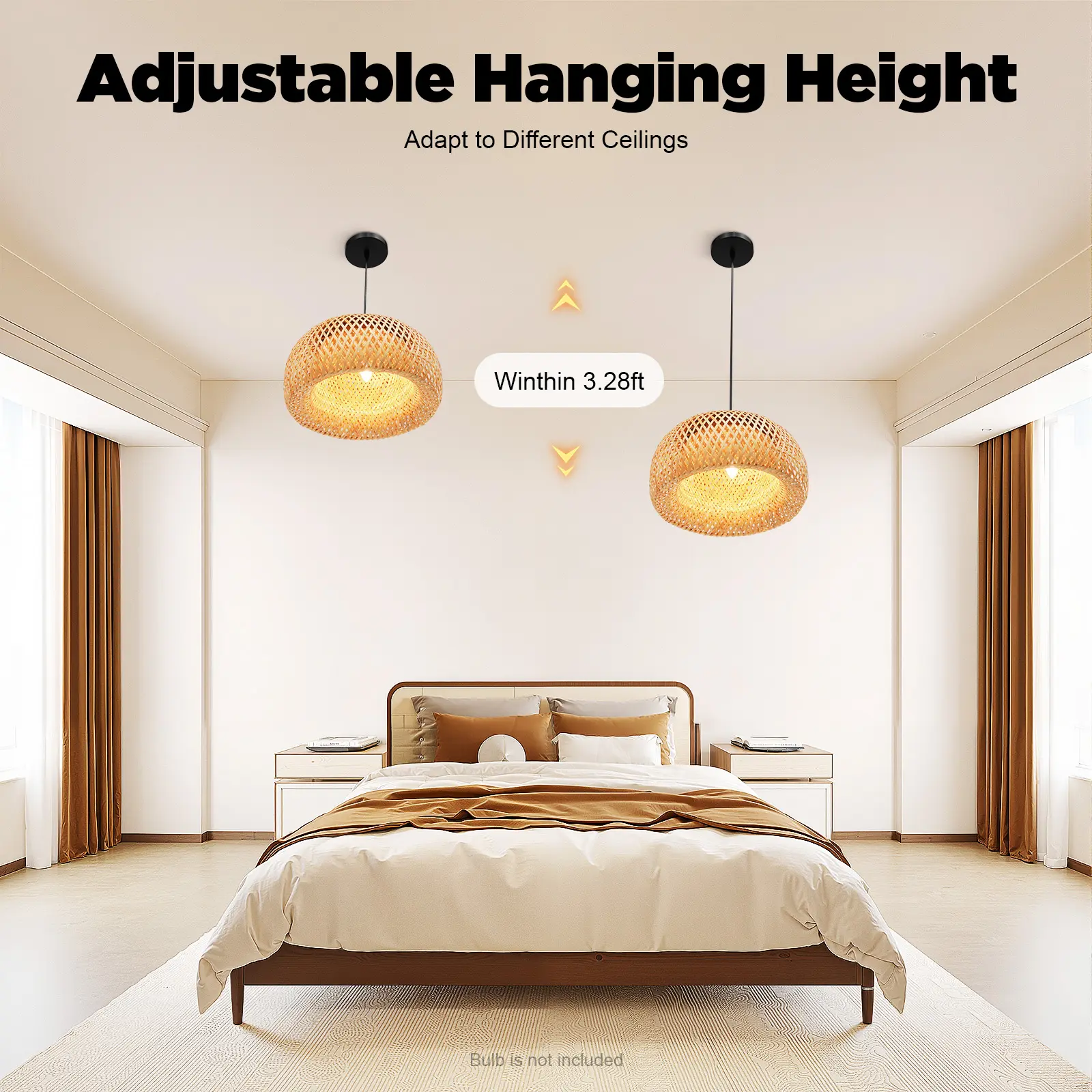 Bring warmth and texture to any room with this rustic bamboo pendant light. Handcrafted from natural bamboo with a woven finish, it casts a soft, organic glow that transforms modern, boho, farmhouse, or coastal interiors. The adjustable hanging rope (up to 1.1m/3.6ft) lets you customize the drop height, making it perfect for vaulted or sloping ceilings. Compatible with any E26 bulb (max 40W, not included) – use a vintage Edison bulb for extra charm.