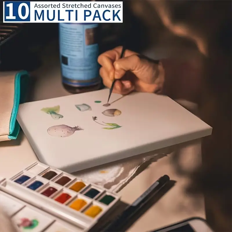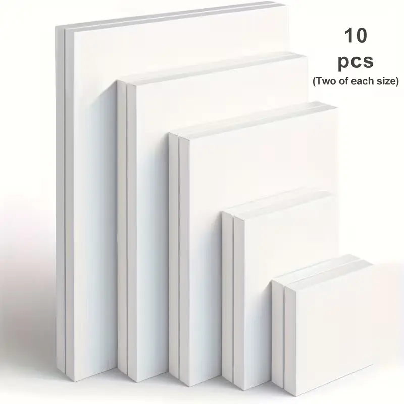 This 10-pack multi-size art canvas set includes various popular sizes to meet all your painting needs. Made of 100% pure white art canvas with solid wood frame, these stretched canvases are sturdy, durable and designed for long-lasting artwork.